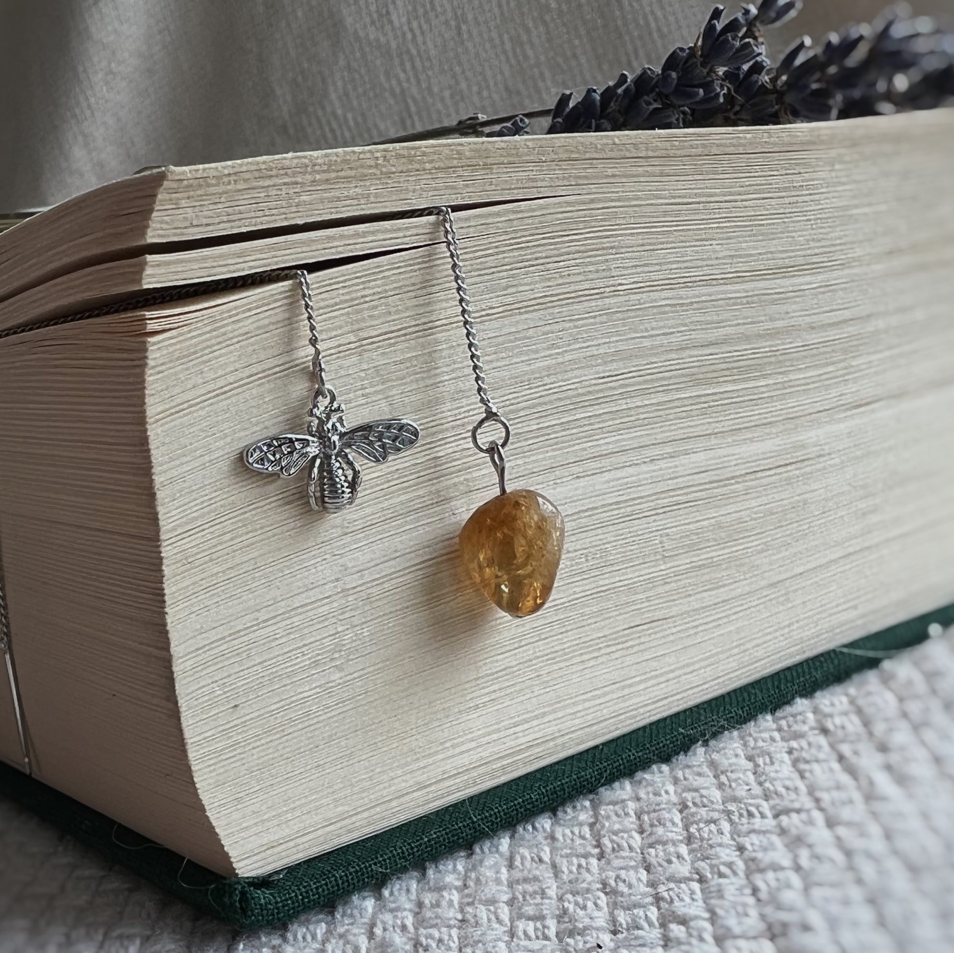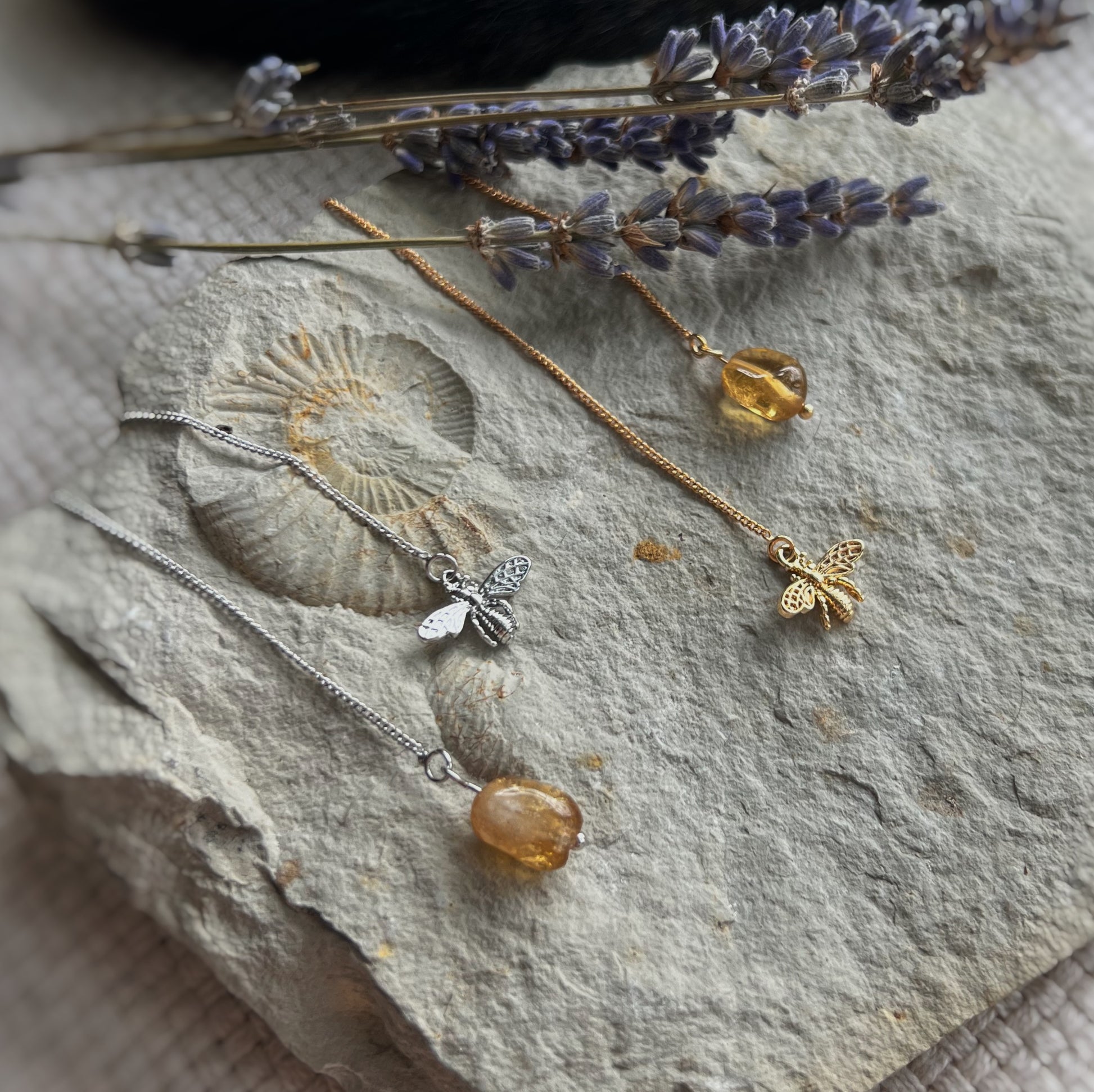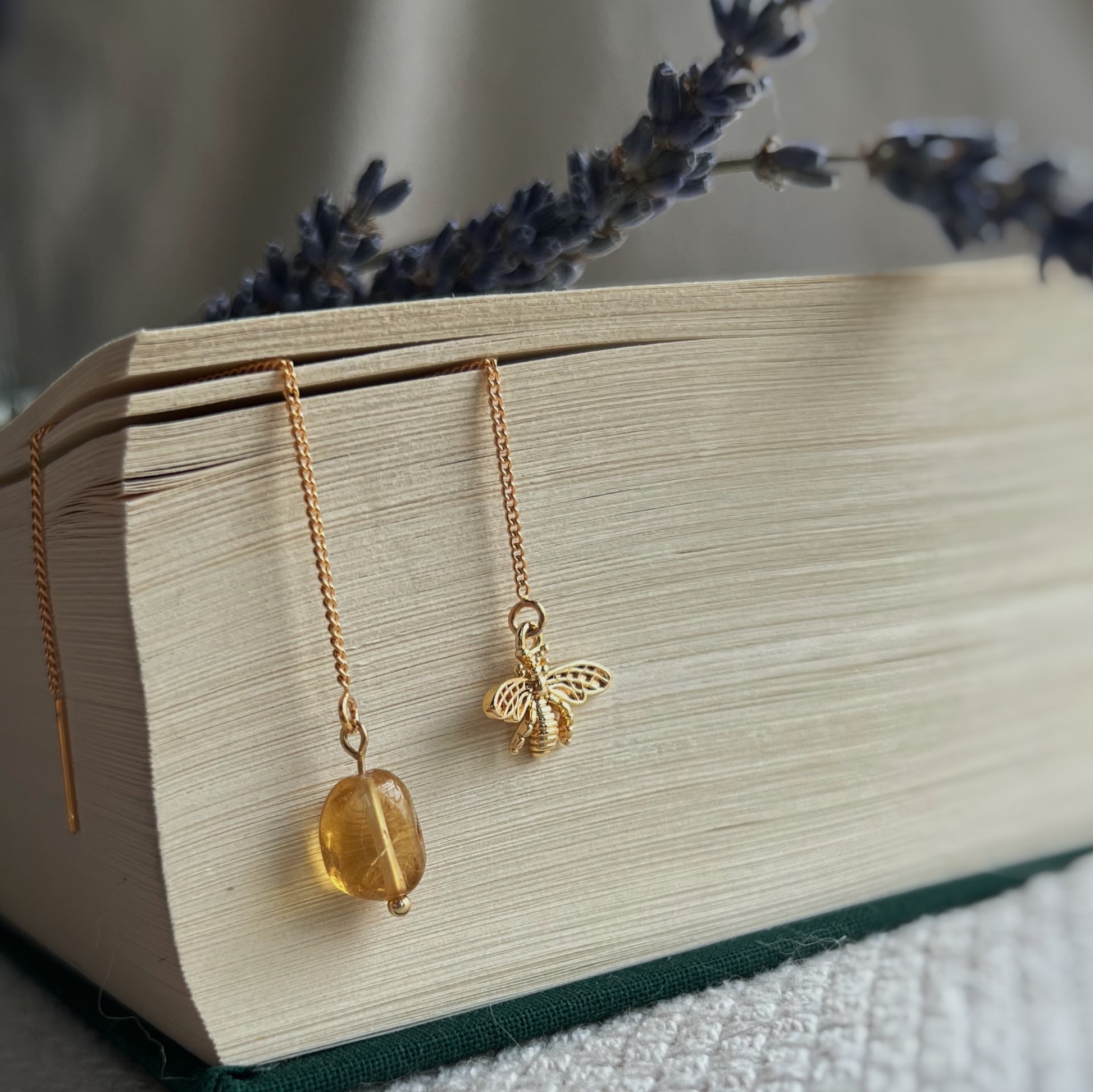 Diese asymetrischen Fädelohrringe sind wie ein Liebesbrief an die Natur, mit zarten Citrinanhängern, die den goldenen Glanz von Honig widerspiegeln, und bezaubernden Bienenanhängern. Der Citrin erinnert an die süße Fülle der Natur und die Bienenanhänger symbolisieren die unermüdliche Arbeit dieser faszinierenden Kreaturen. Handgefertigt mit Liebe zum Detail, sind sie ein elegantes Symbol für die zeitlose Schönheit und Bedeutung der Natur.