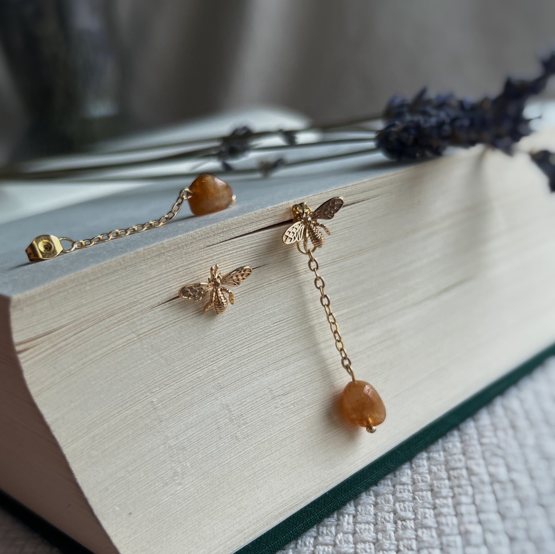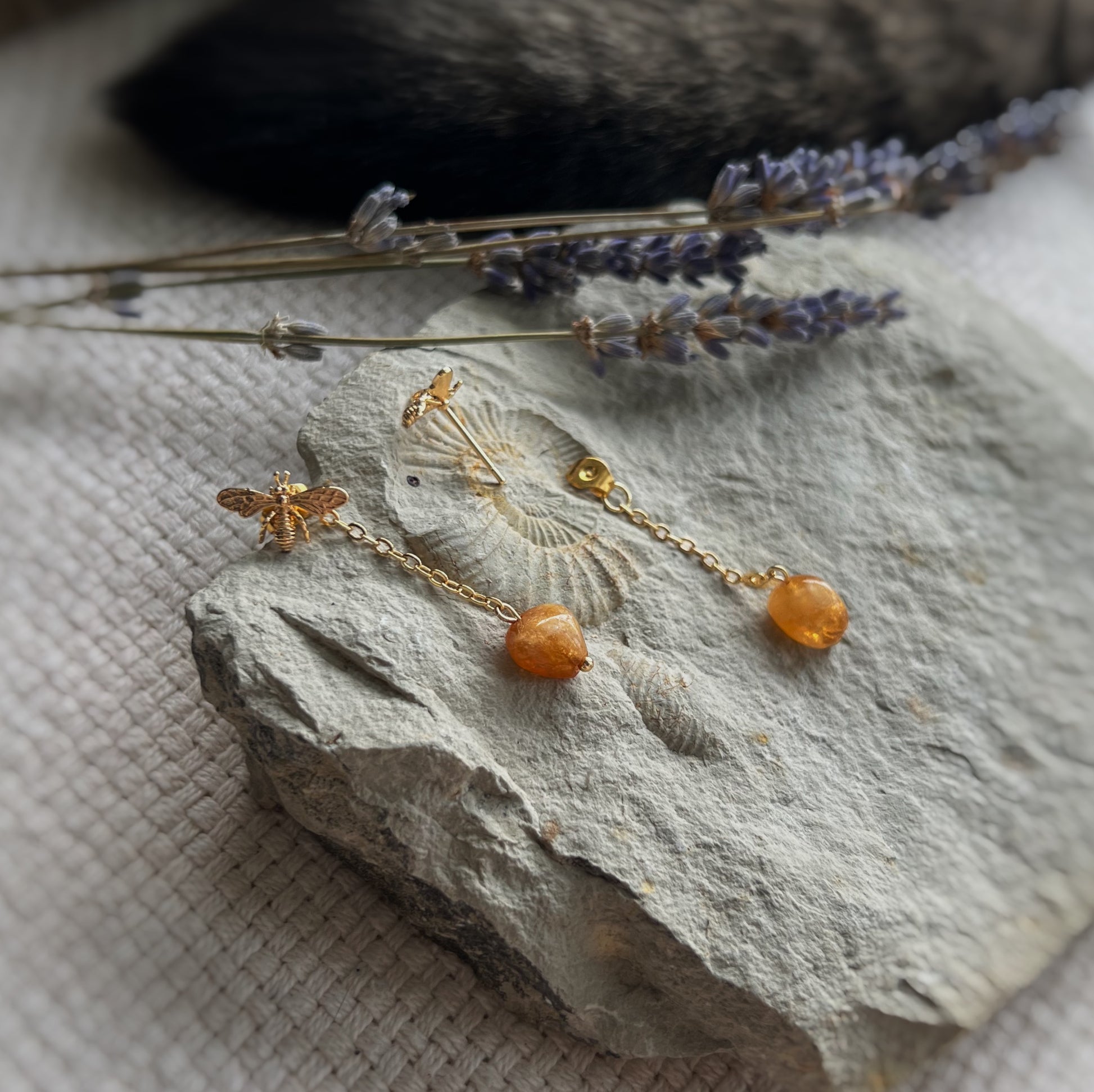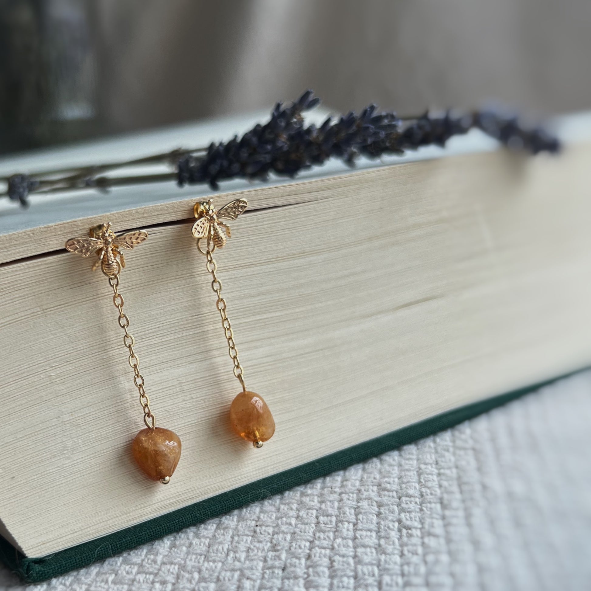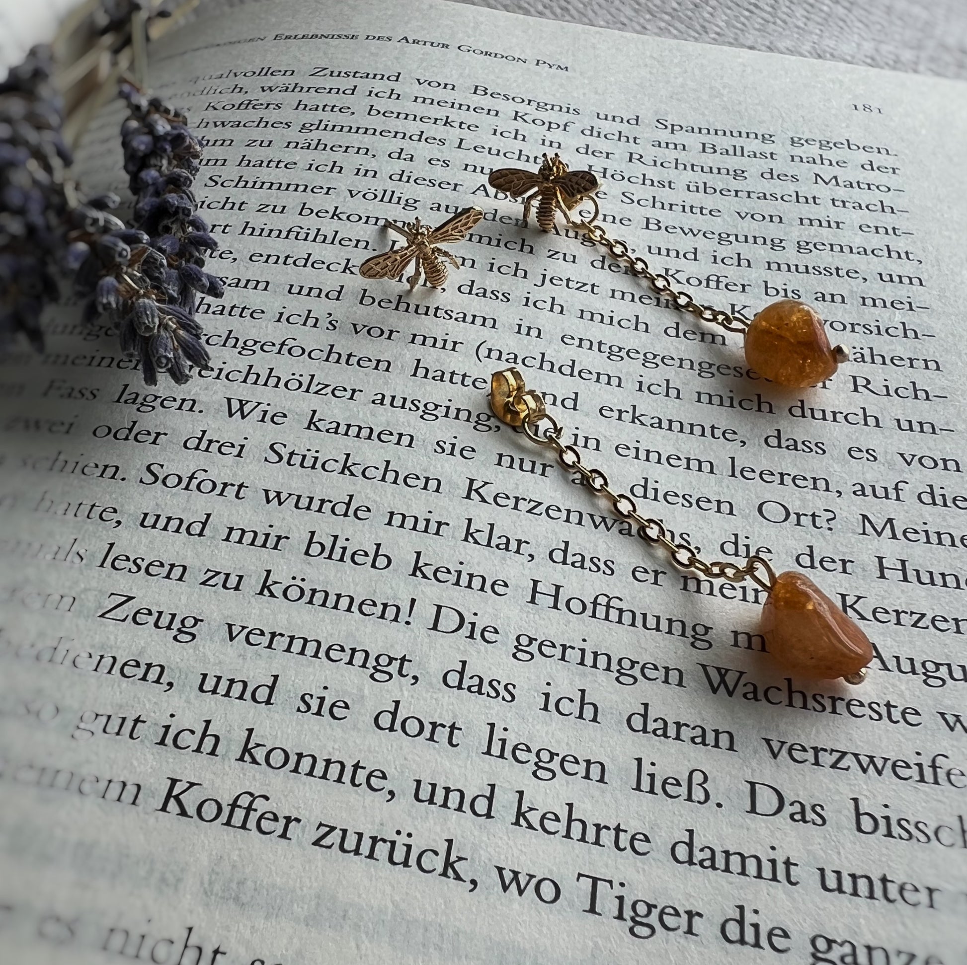 Diese Ohrringe sind inspiriert von der Natur, mit Bienensteckern aus vergoldetem Messing und Citrinanhängern, die den goldenen Glanz von Honig repräsentieren. Die sanfte Schönheit des Citrins erinnert an die süße Fülle der Natur und die harmonische Beziehung zwischen Bienen und Blumen. Handgefertigt mit Liebe zum Detail, symbolisieren sie die zeitlose Verbindung zwischen Mensch und Umwelt.