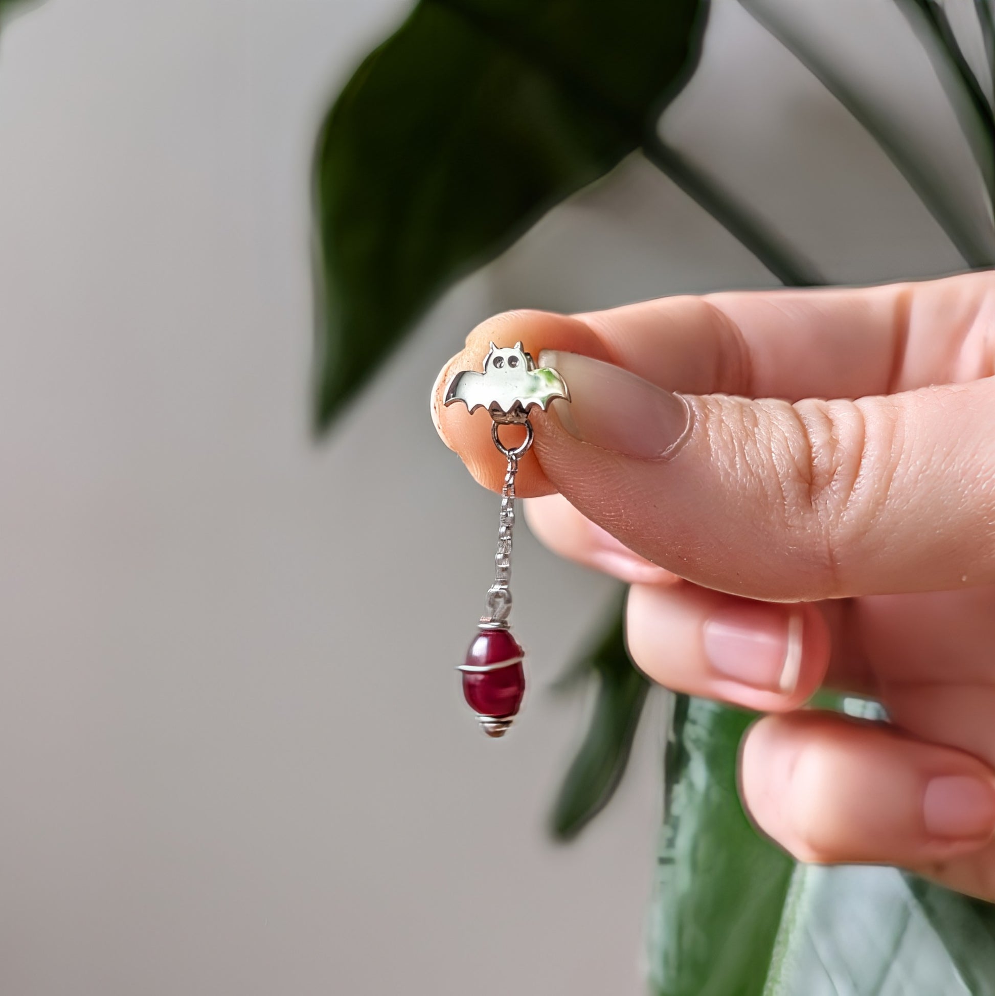 Zwei zarte Fledermäuse aus Edelstahl für eine Ohren – wahlweise solo oder mit tiefroten Chalzedontropfen, die wie Blutperlen an der Nacht hängen. Die Edelsteinanhänger sind abnehmbar und lassen sich ganz nach Stimmung oder Anlass tragen. Ein wandelbares Schmuckstück zwischen düsterer Romantik und subtiler Eleganz – perfekt für mondhelle Nächte, Halloween oder einfach den Alltag mit einem Hauch Magie.