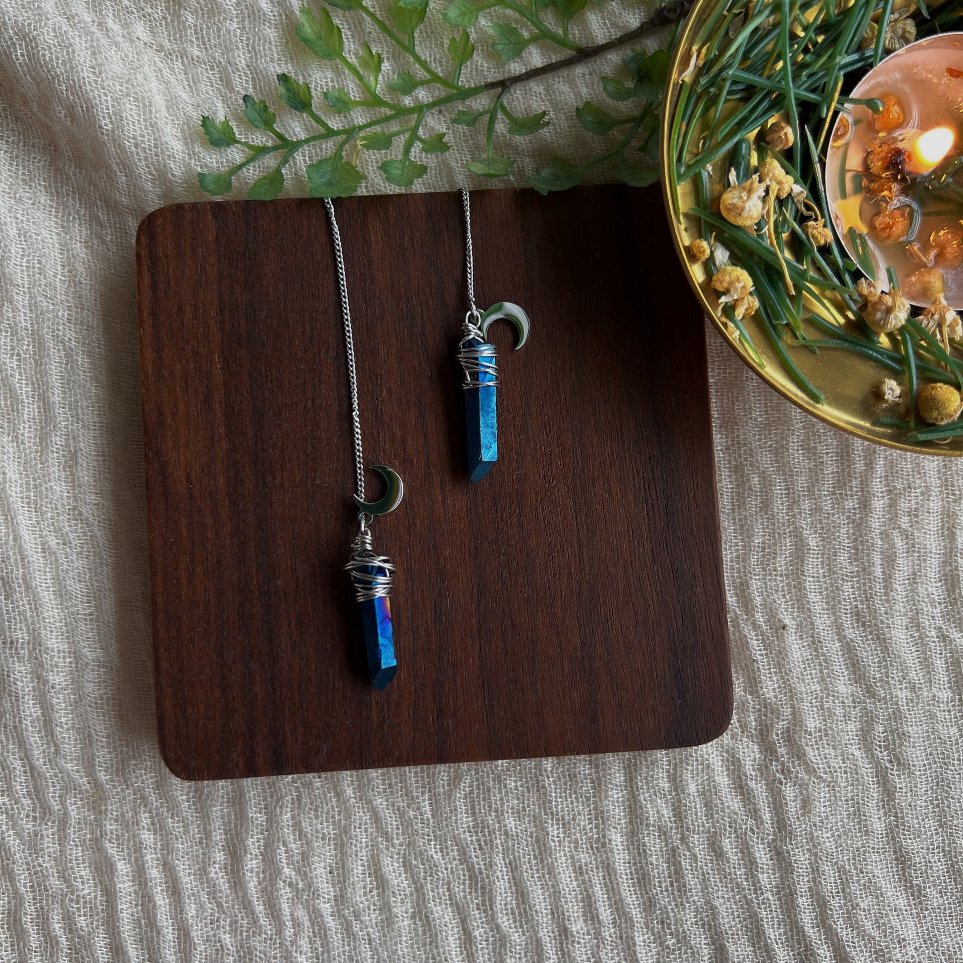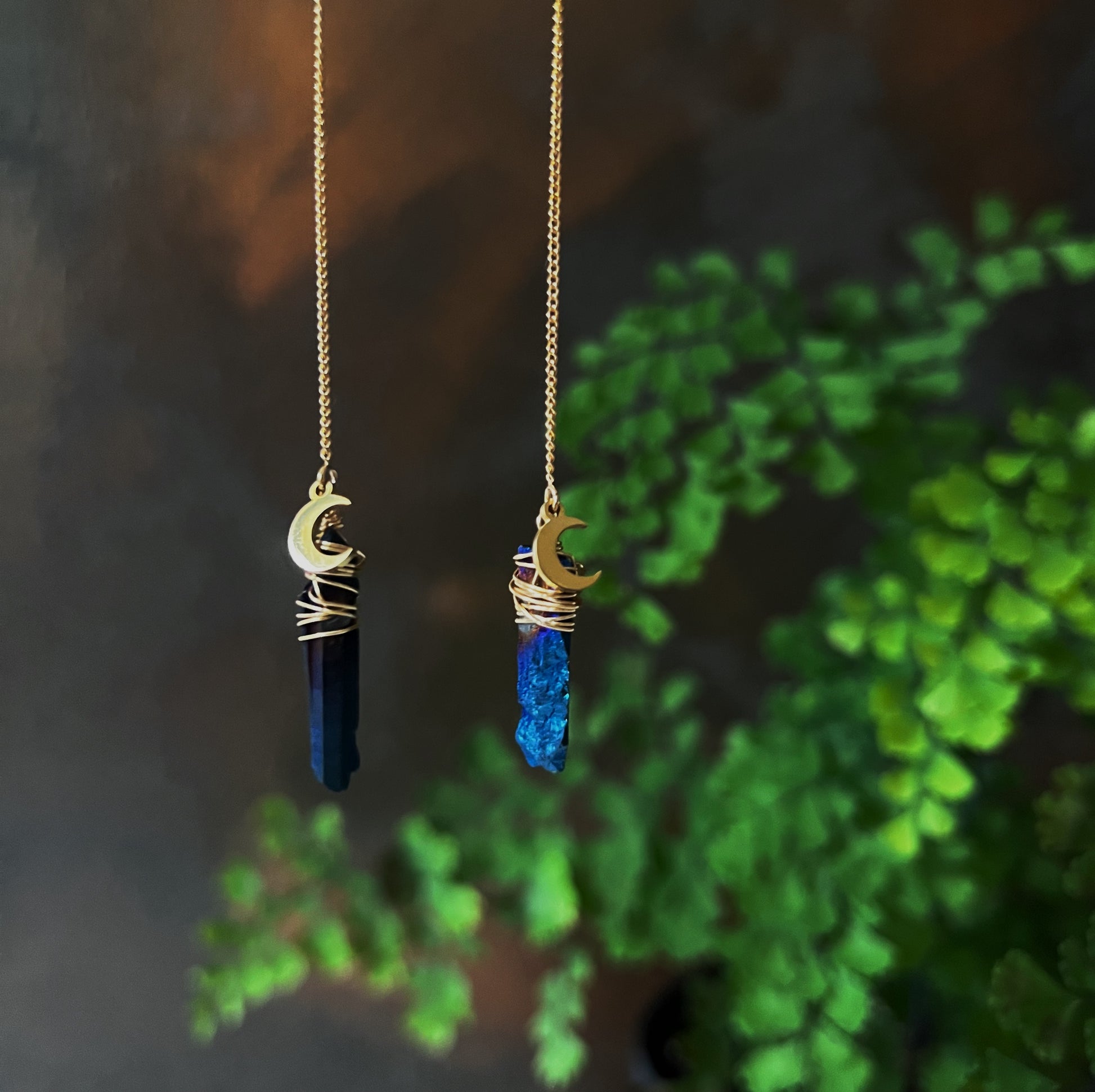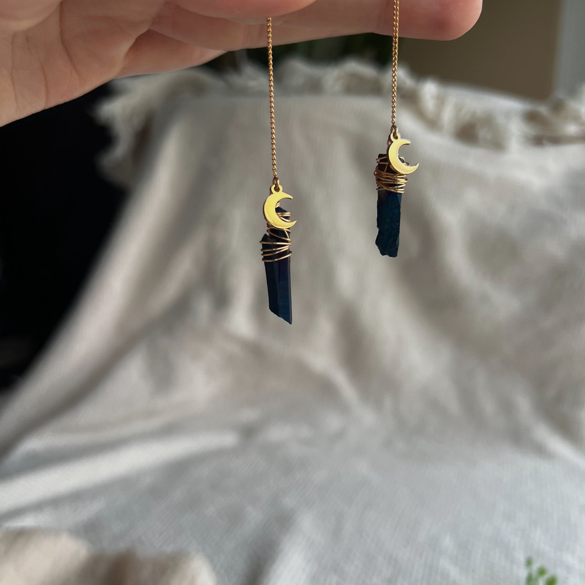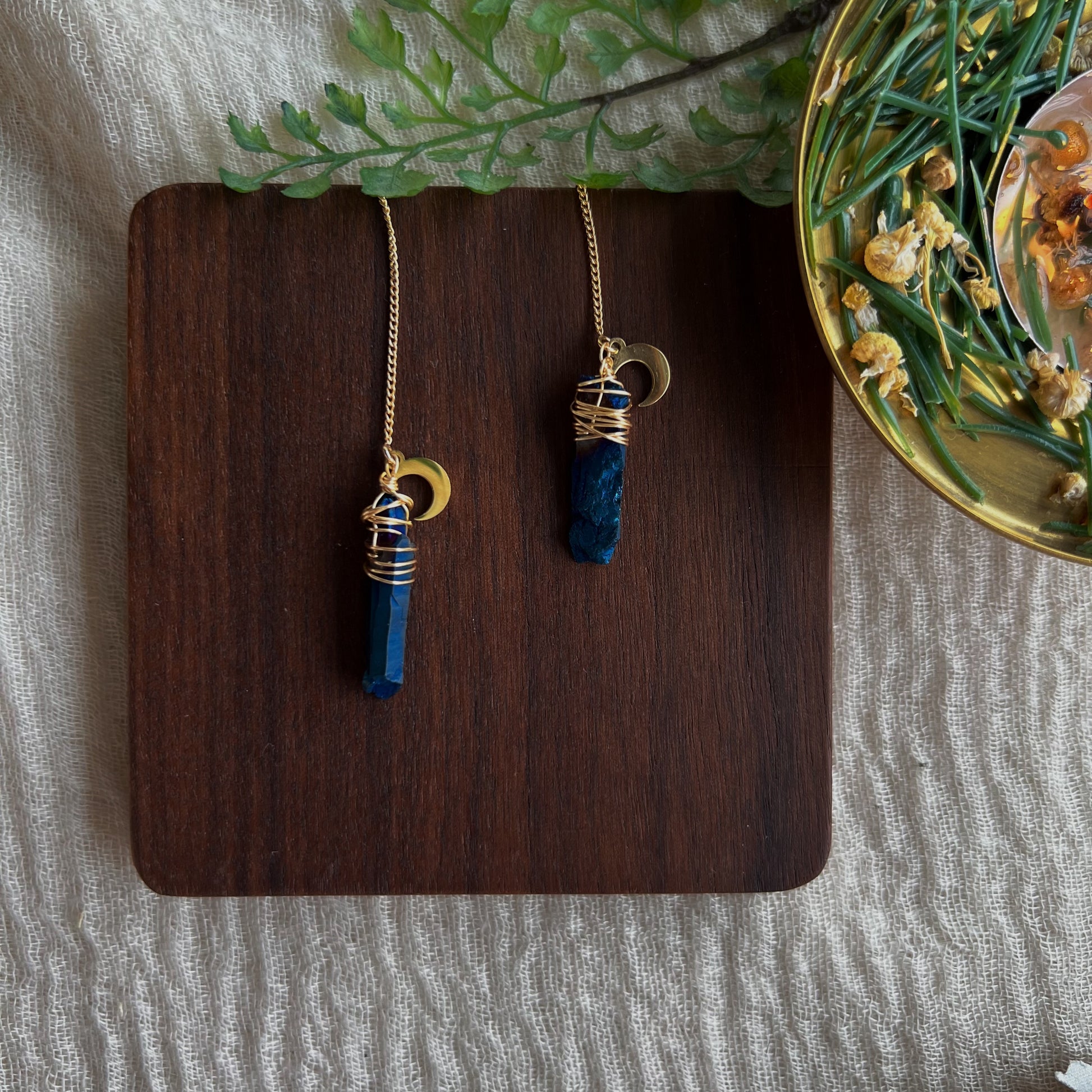 Diese handgefertigten Ohrringe, verziert mit tiefblauen Kristallen und goldenen Mondsicheln, fangen die geheimnisvolle Aura einer klaren Halloween-Nacht ein. Sie sind das ideale Schmuckstück für alle, die einen Hauch von Magie und Mystik in ihren Look zaubern wollen.