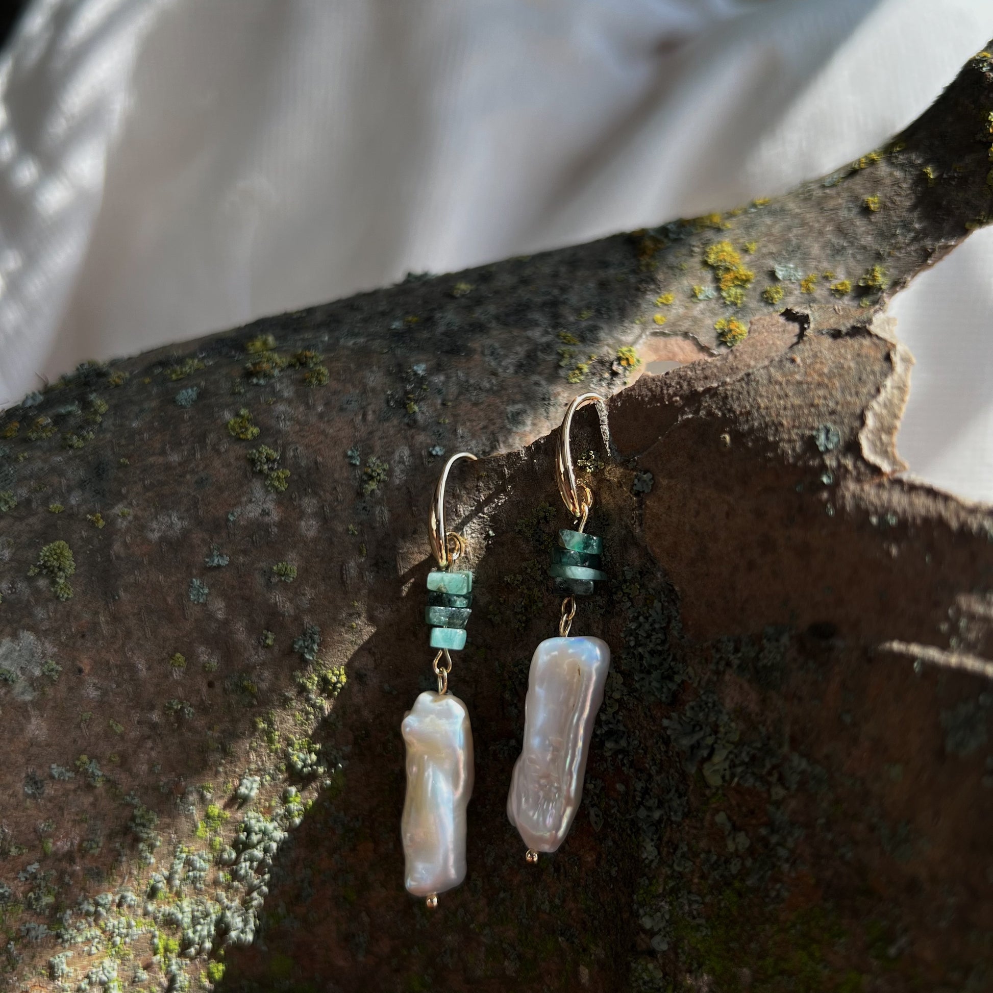 Diese handgefertigten Ohrringe aus Messing verkörpern die Harmonie von Wald und Wasser. Die großen, unregelmäßig geformten Süßwasserperlen, die das Licht wie sanfte Wellen einfangen, verleihen jedem Paar eine einzigartige Ausstrahlung. Die viereckigen, kleinen Smaragdsteine darüber erinnern an die tiefen, satten Grüntöne des Waldes und ergänzen das Design perfekt.