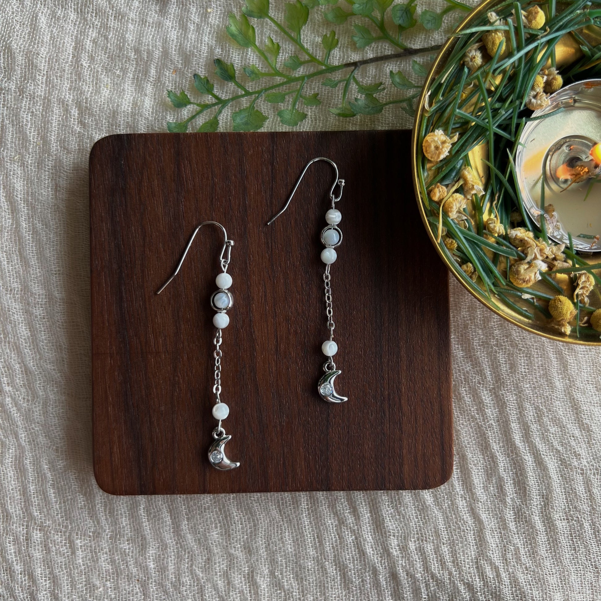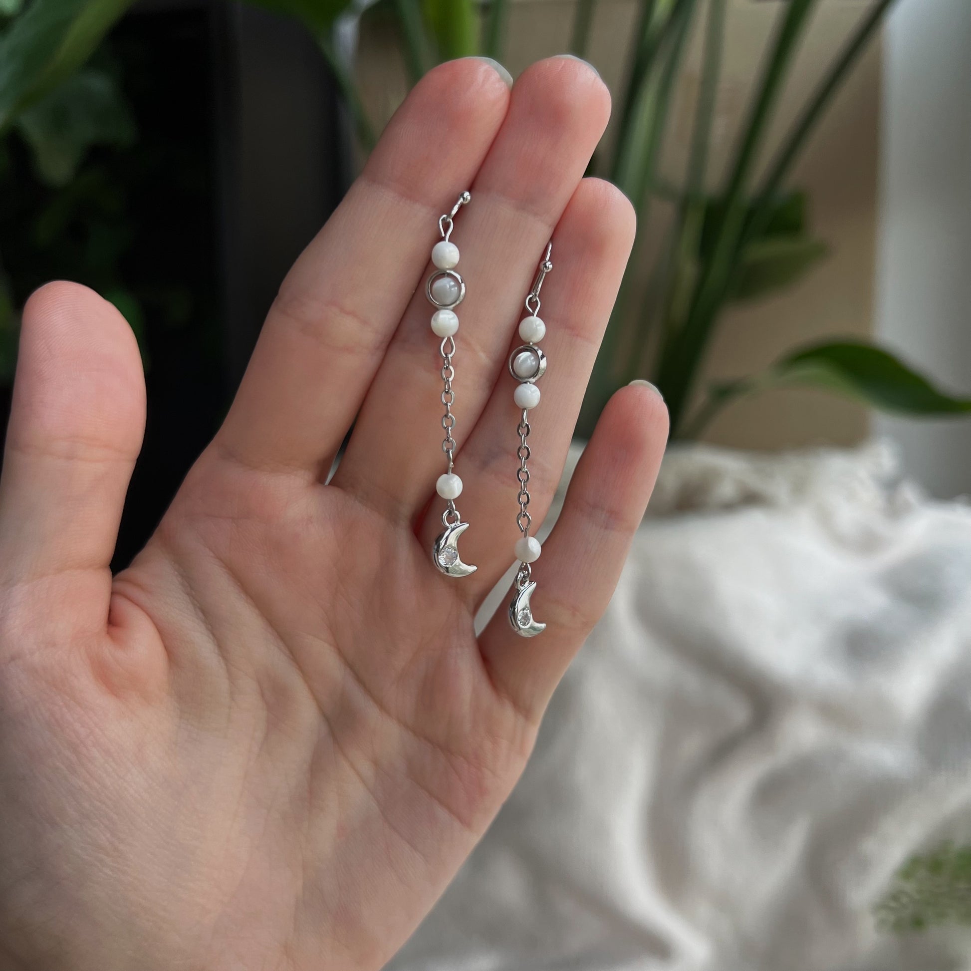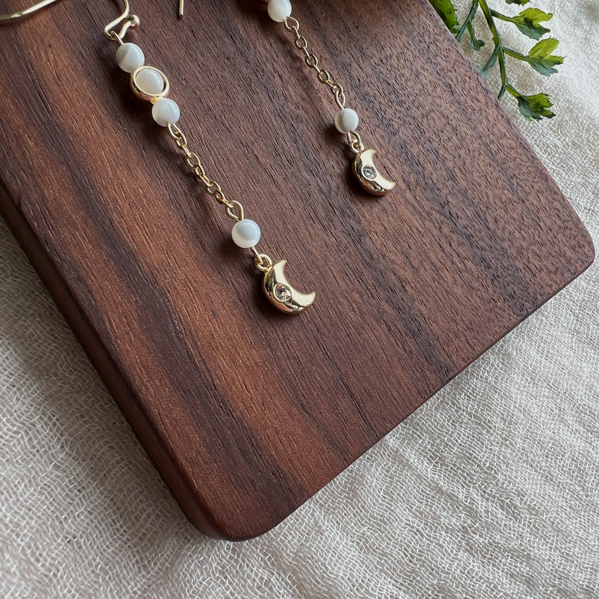 Erlebe die sanfte Eleganz der Natur mit diesen handgefertigten Ohrringen. Die Ohrringe kombinieren edles Messing mit schimmernden Perlmuttperlen und einem filigranen Mondsichel-Anhänger, der an den friedlichen Nachthimmel erinnert.