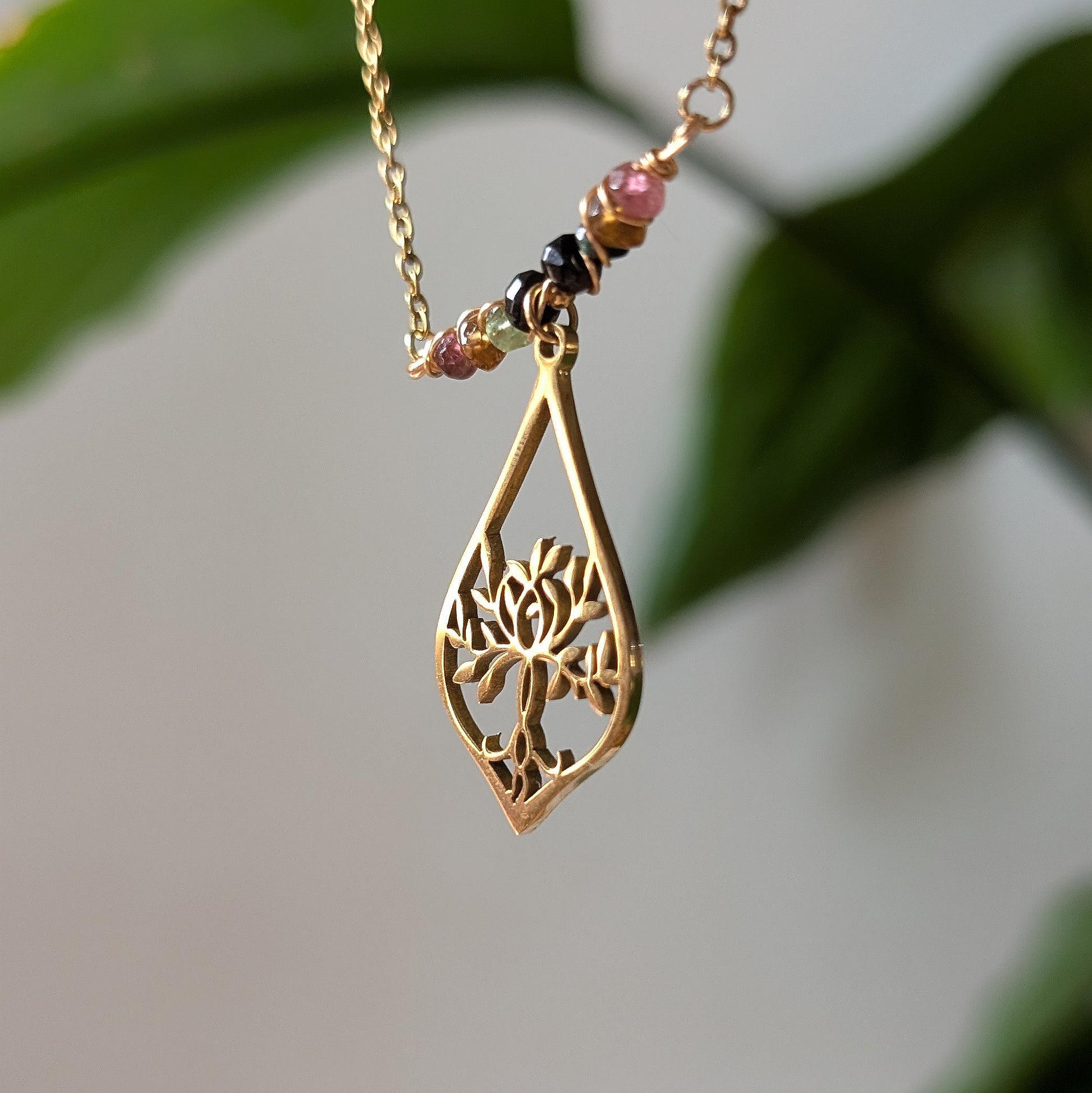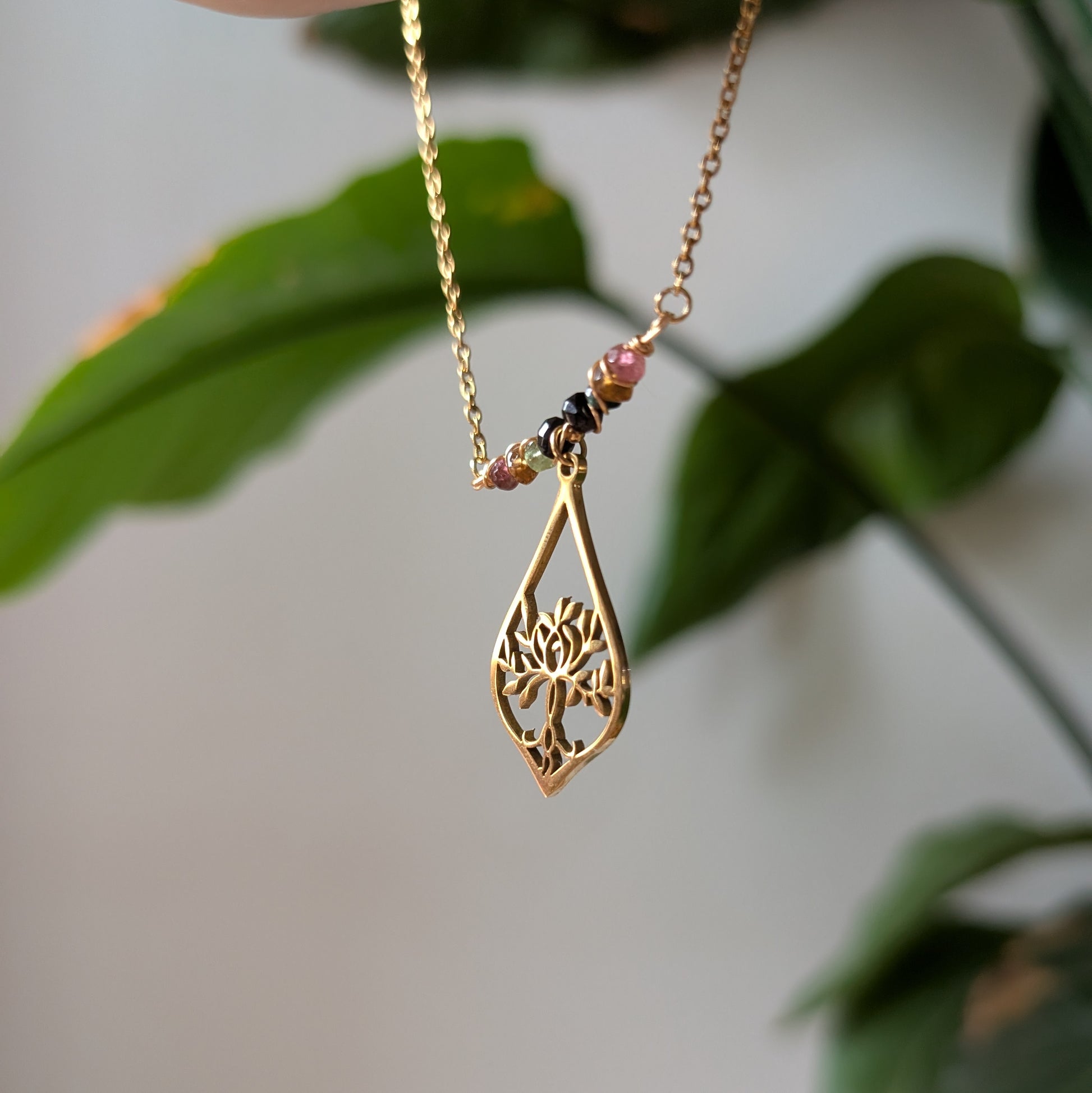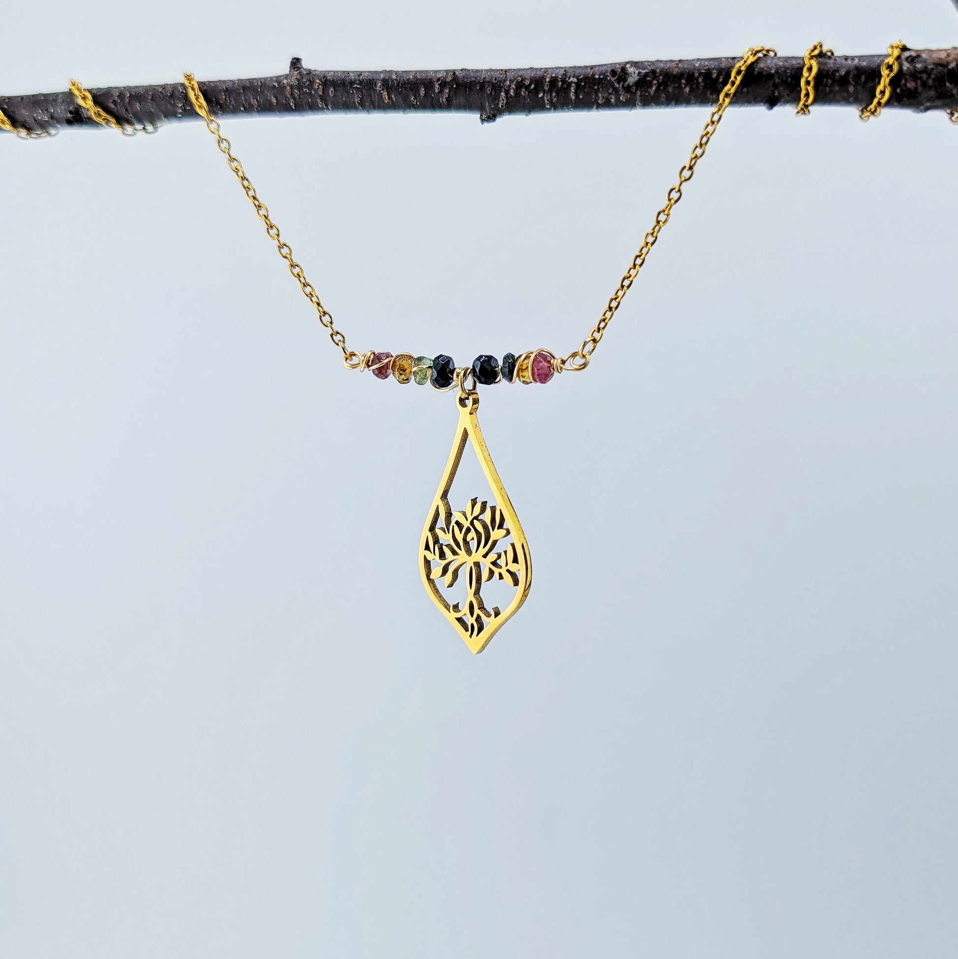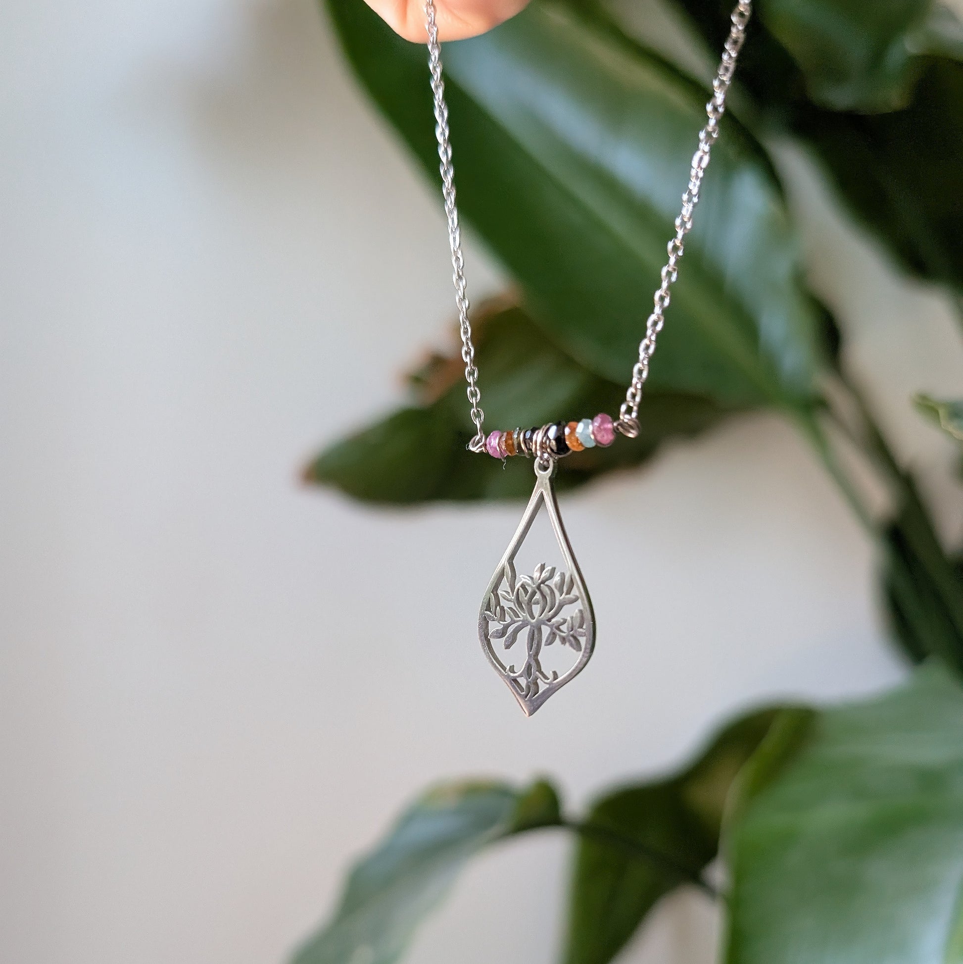 Leicht und doch voller Ausdruck: Diese KEhre aus Edelstahl trägt das Symbol des Lebensbaums und eine Reihe farbenfroher Turmaline.