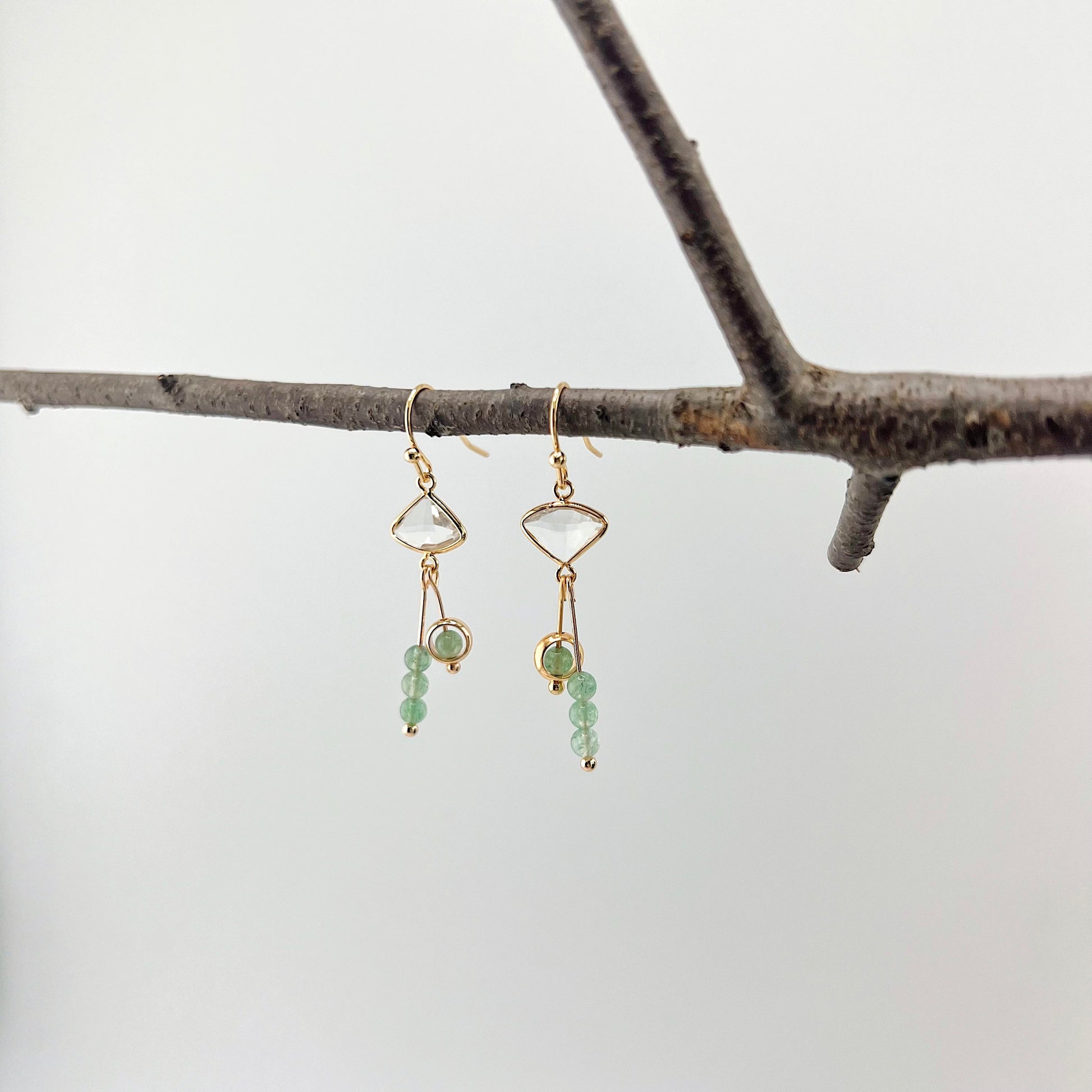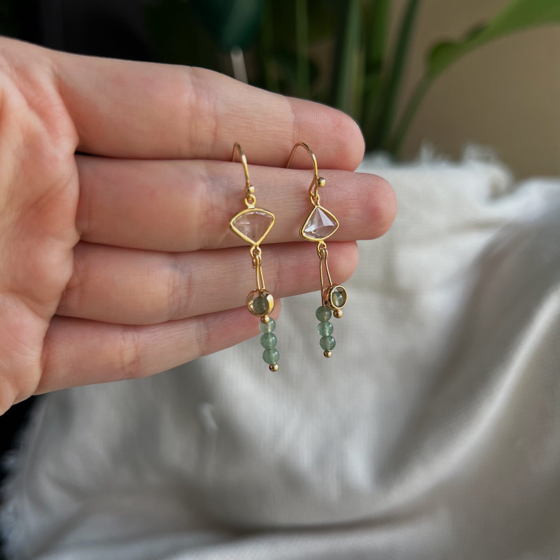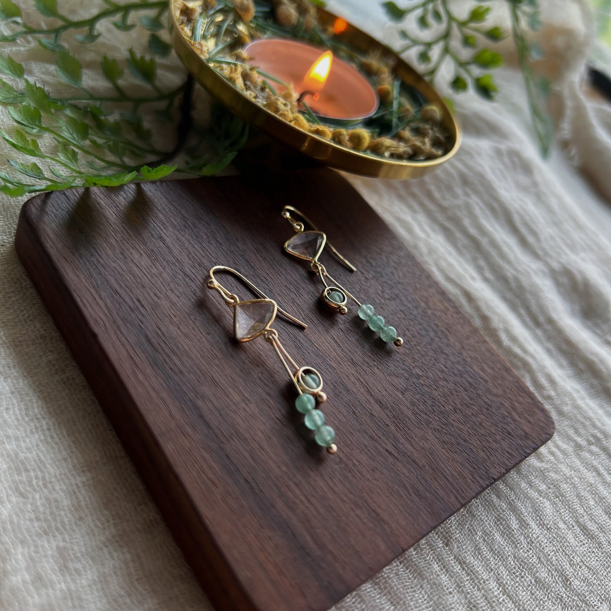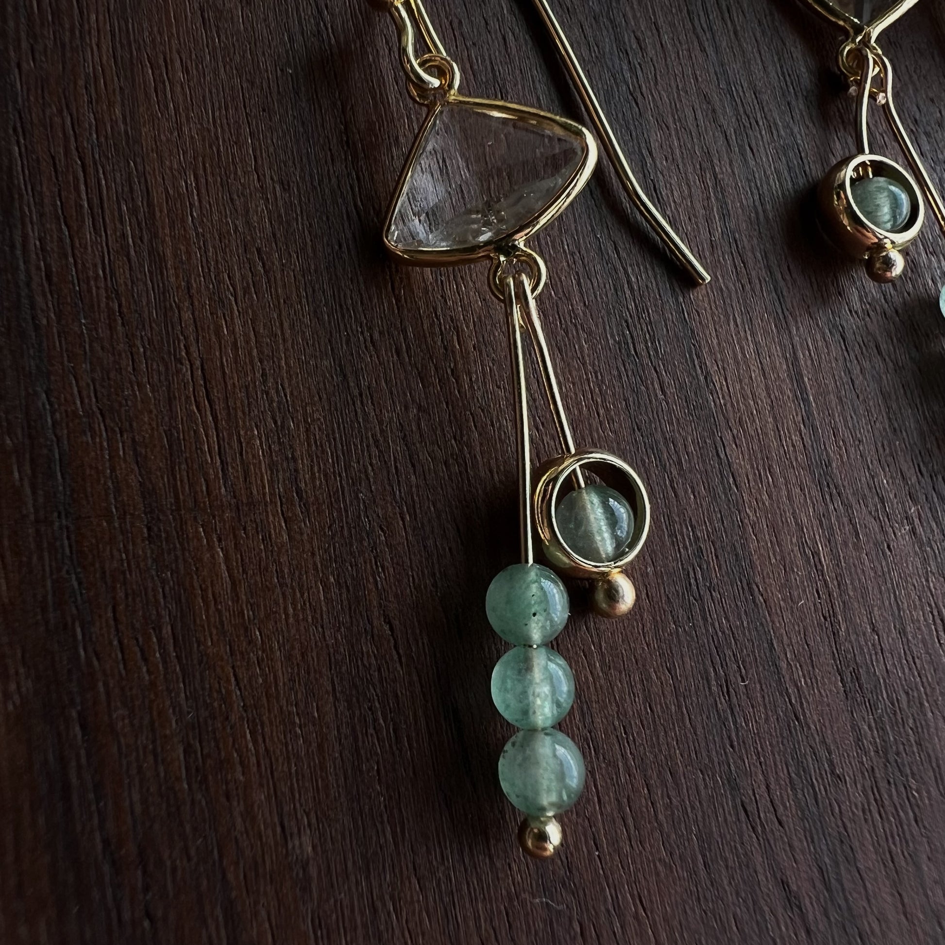 Stell dir vor, du trägst die Frische eines Waldspaziergangs und den Glanz eines klaren Morgens bei dir. Diese Ohrringe verbinden die natürliche Schönheit von Aventurin und geschliffenem Glas in einem einzigartigen Design.