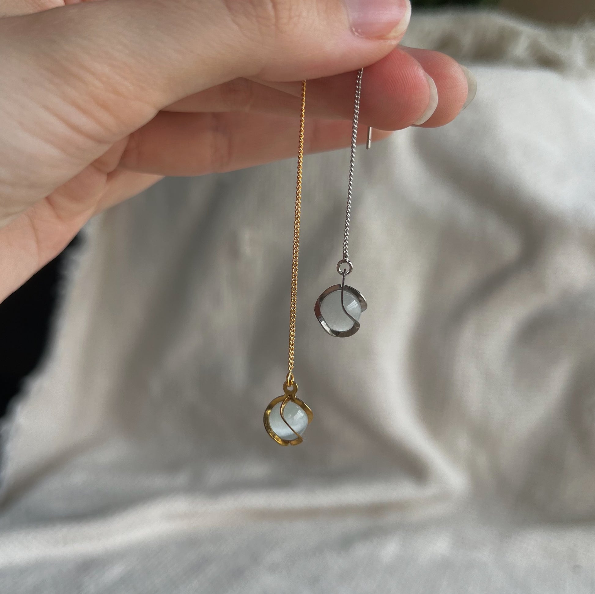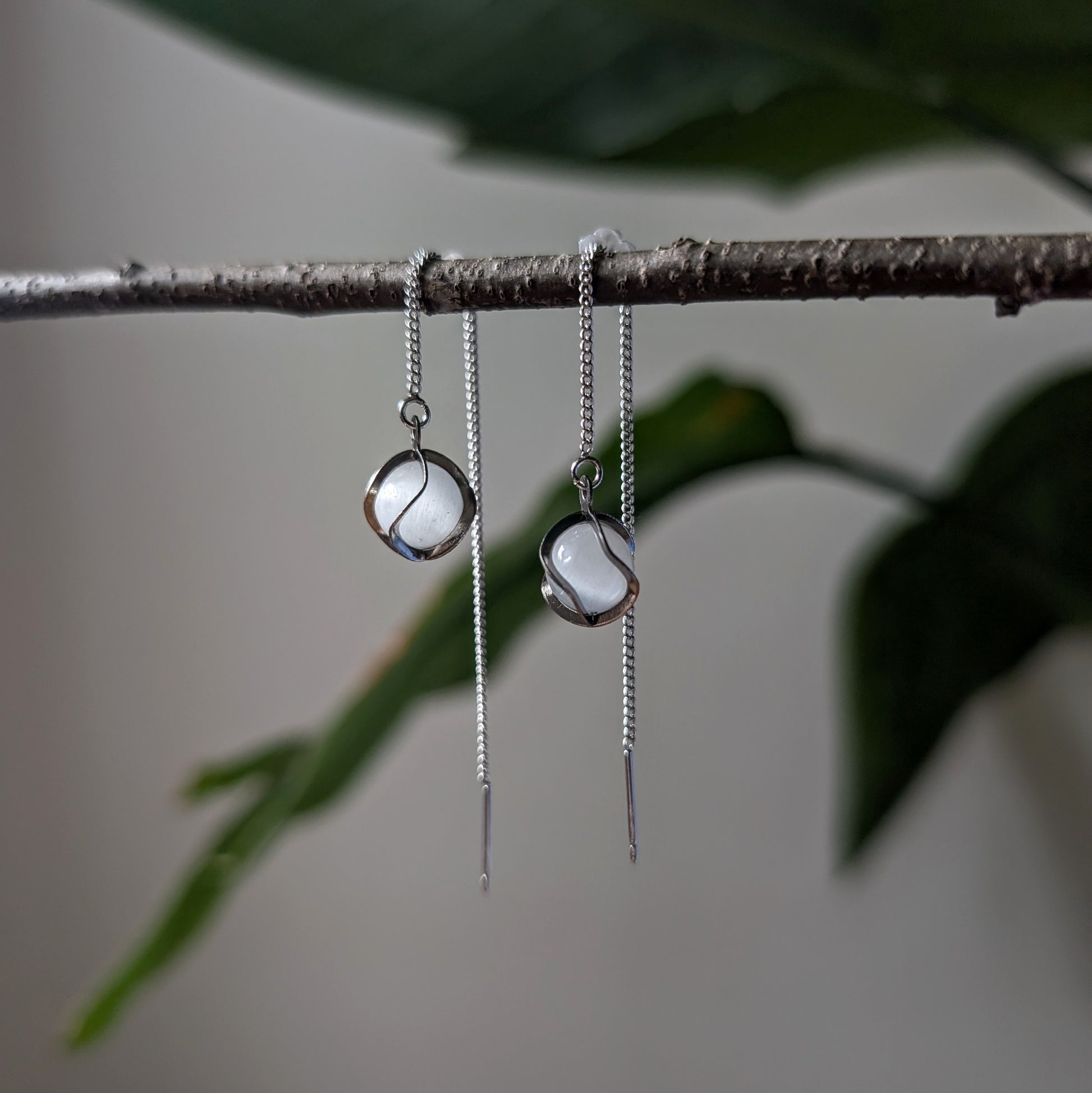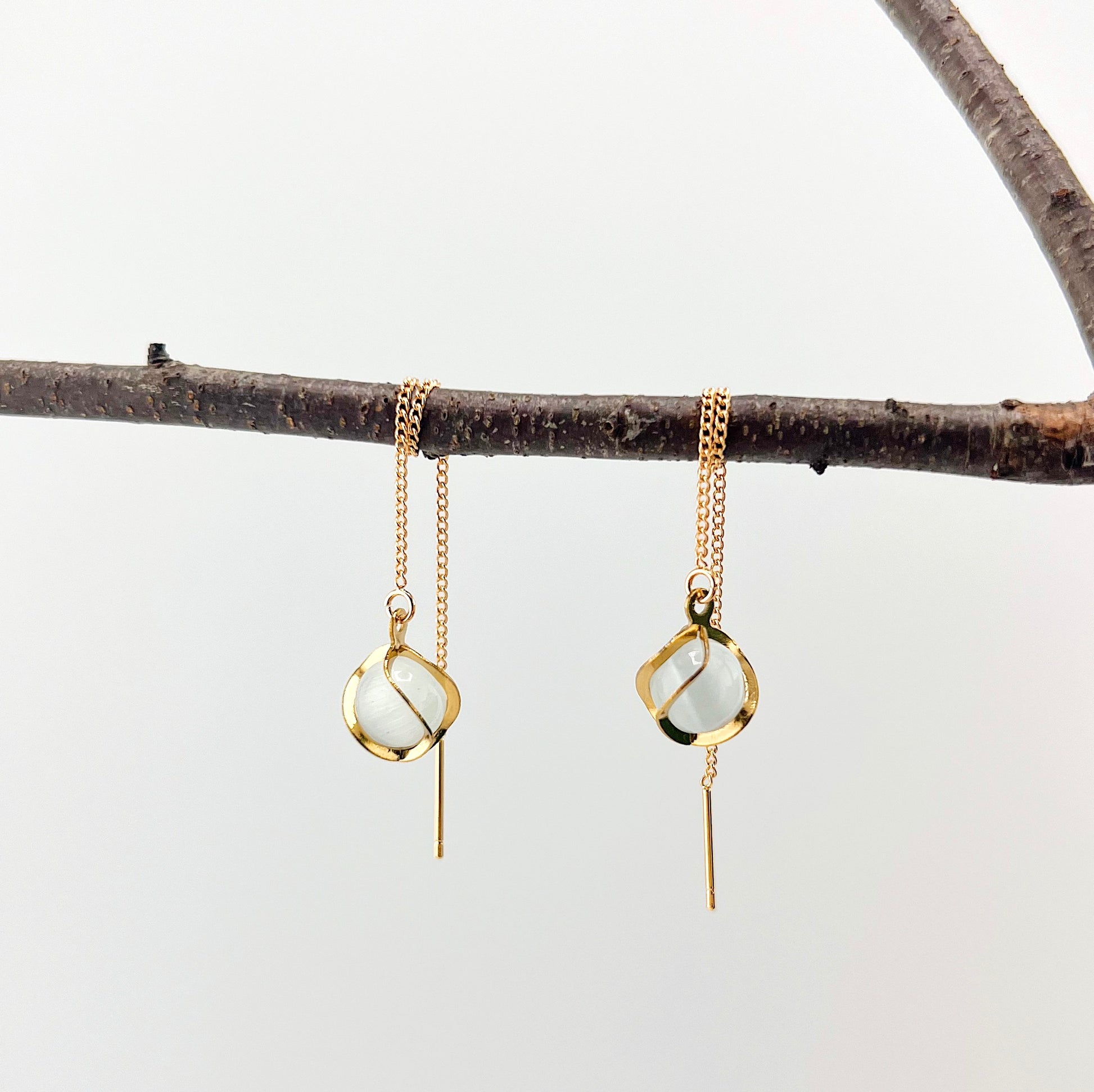Diese Fädelohrringe bestehen aus hochwertigem Messing und sind mit einem eleganten Anhänger aus weißem Katzenaugenglas in einer Edelstahlfassung verziert.