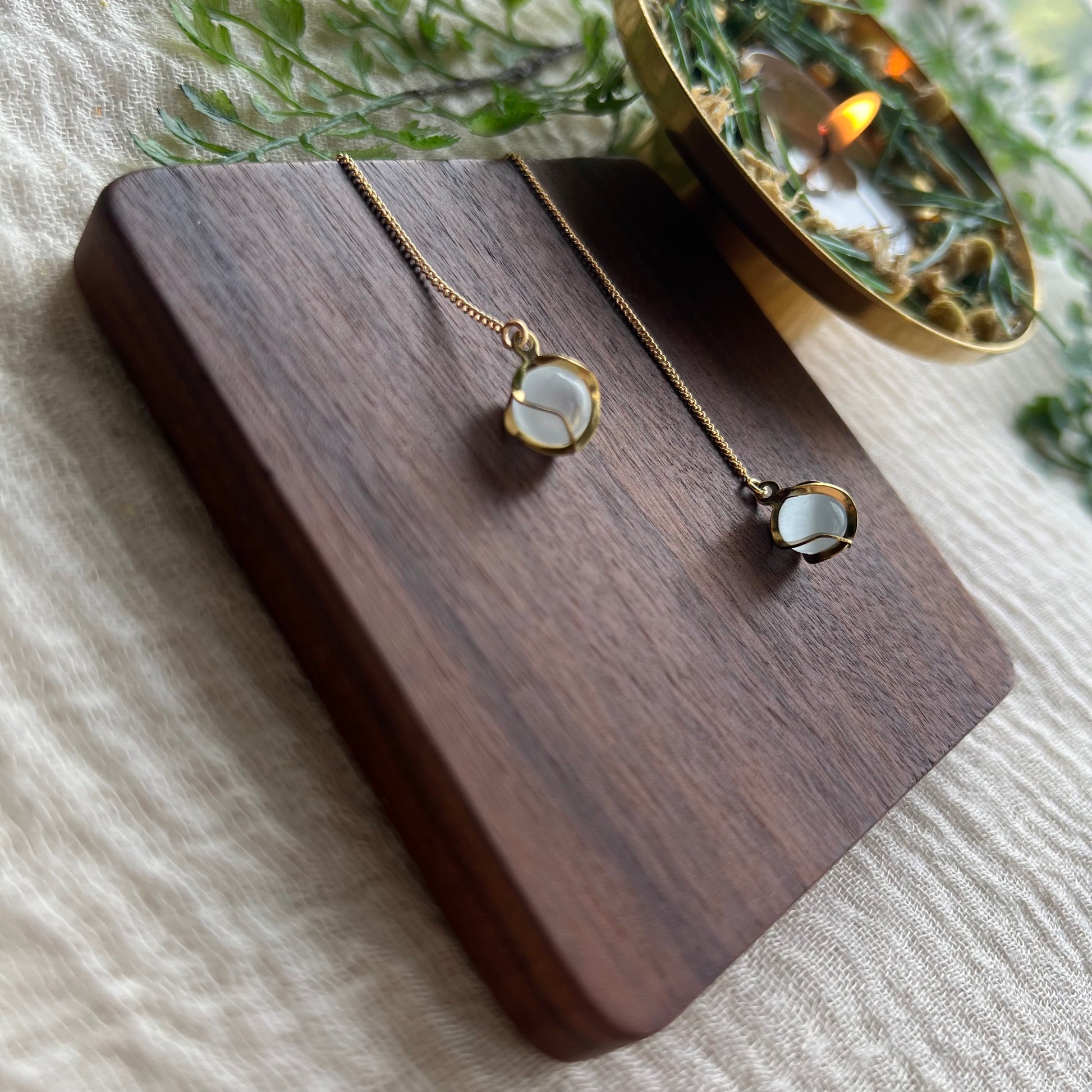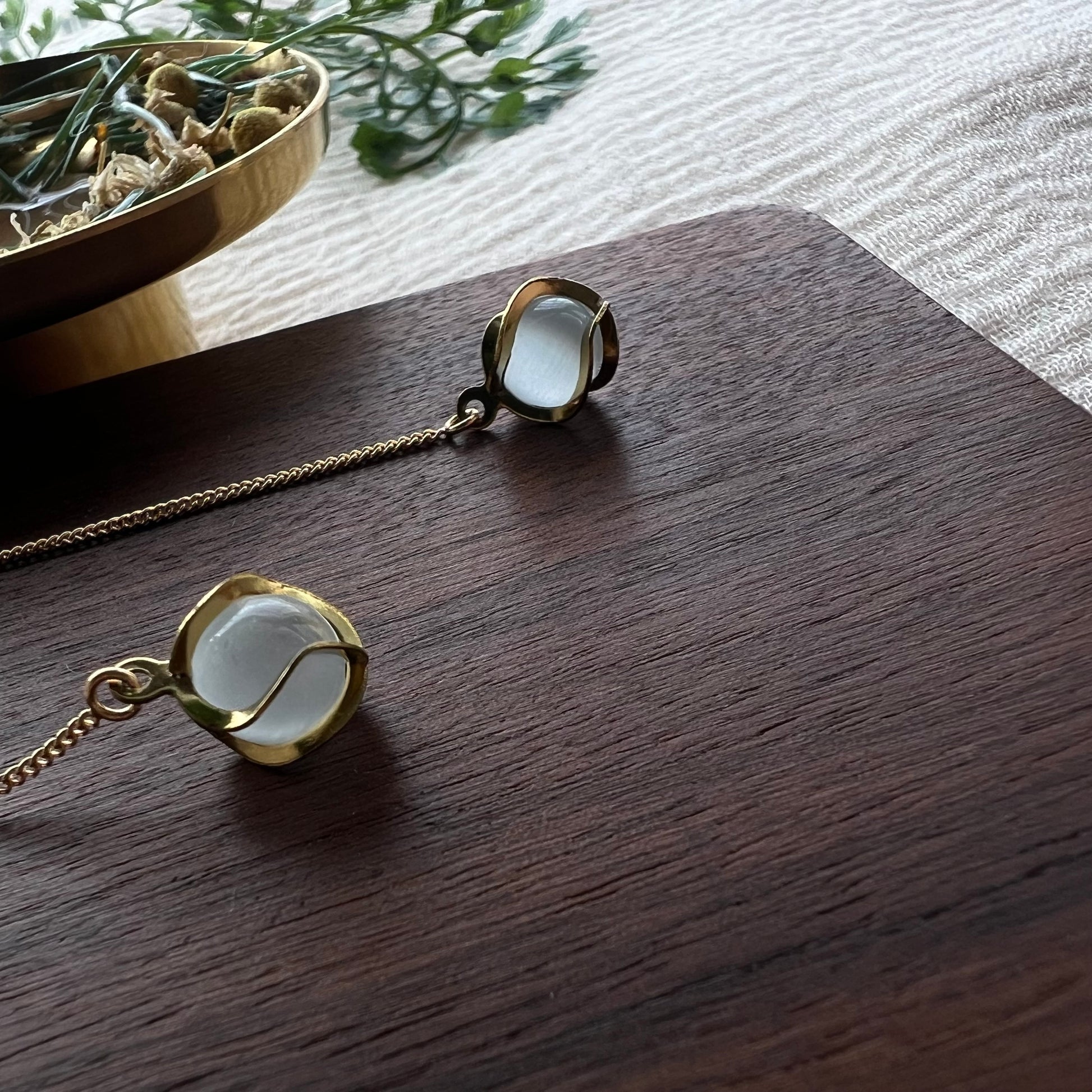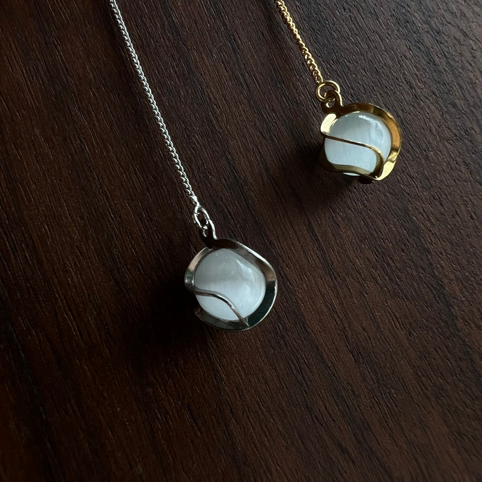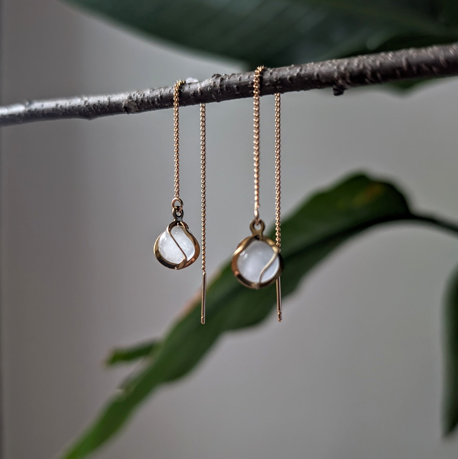 Diese Fädelohrringe bestehen aus hochwertigem Messing und sind mit einem eleganten Anhänger aus weißem Katzenaugenglas in einer Edelstahlfassung verziert.