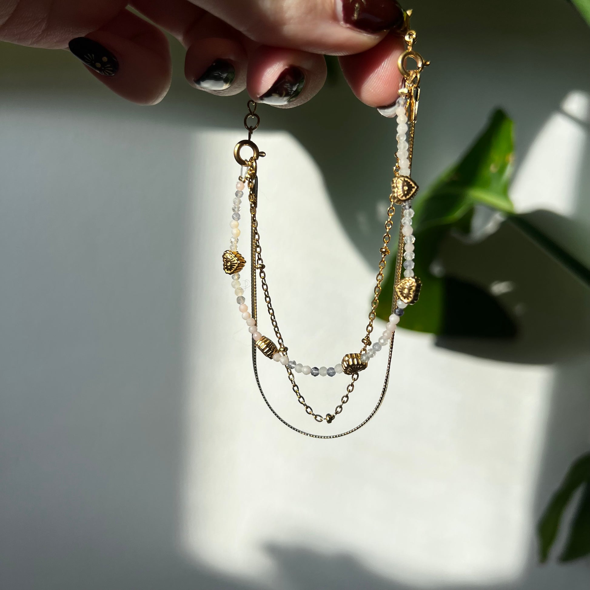 Material: Edelstahl und Mondstein, Rosenquarz, rosa Opal und Cordierit