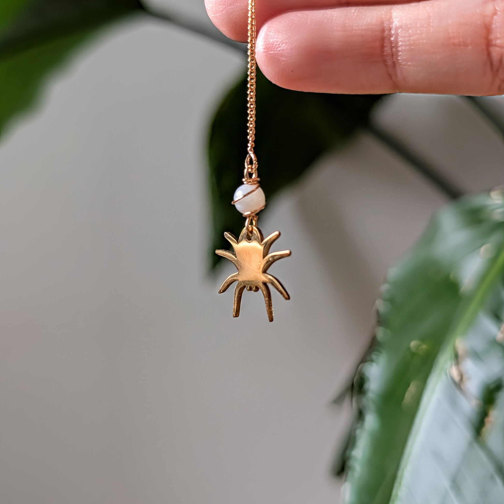 Ein zarter Schauer in der Herbstnacht: Diese Fädelohrringe vereinen die Magie des Vollmonds mit dem mystischen Symbol der Spinne. Eine schimmernde Perlmuttperle – eingefasst in filigranen Draht wie in ein Spinnennetz gehüllt – fängt das Licht der Dämmerung ein. Darunter tanzt eine kleine Spinne aus Edelstahl – still, wachsam, bereit ihr Netz zu weben.