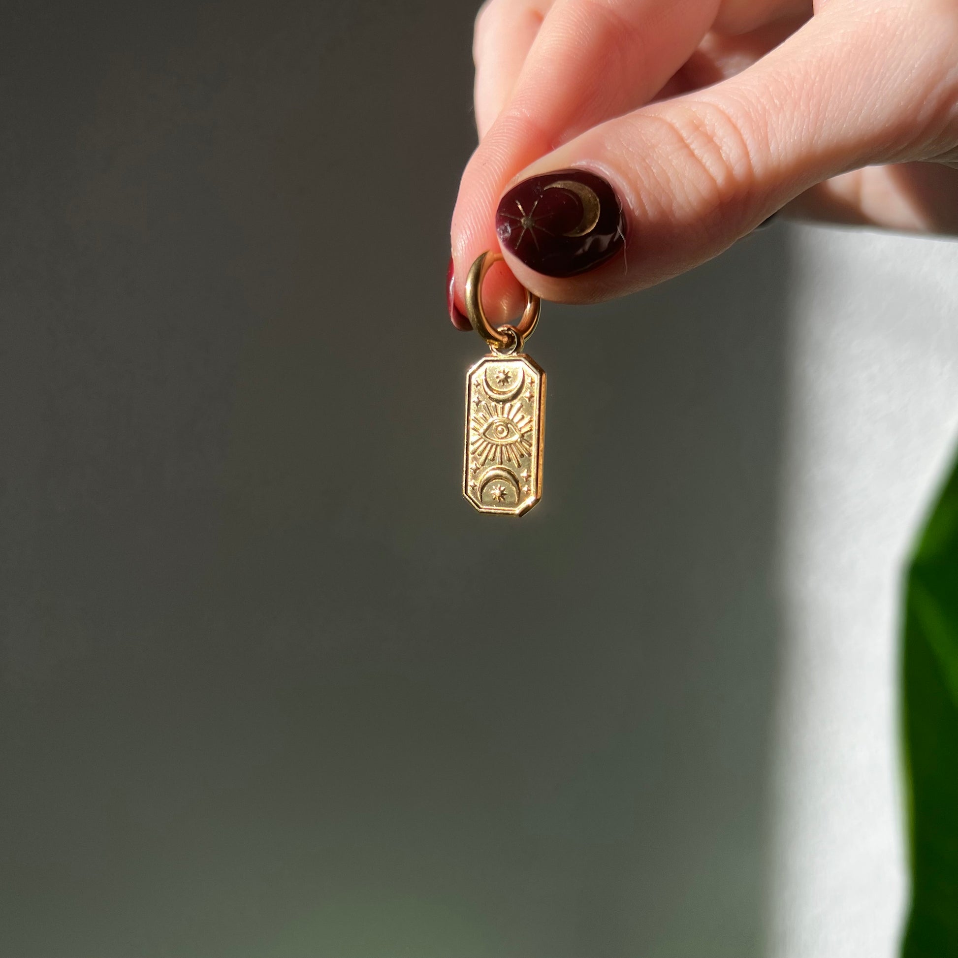 Creole aus Edelstahl mit einem rechteckigen Anhänger, geprägt mit Mond, Auge und Sternen. Feiner Kontrast aus zarter Struktur und kühlem Metall, erinnert an Tarot- und Nachthimmel-Symbole. Passen perfekt zu dem SIGNE - Kettenset und dem SIGNE - Armband.