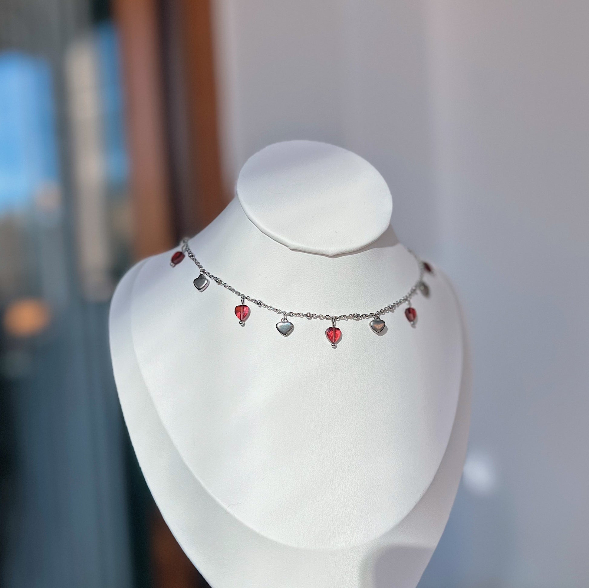 Diese filigrane Kette setzt mit ihren herzförmigen Granat-Anhängern ein wunderschönes Zeichen der Liebe. Das tiefe Rot des Granats strahlt Wärme und Leidenschaft aus, während die Edelstahlelemente für zeitlose Eleganz sorgen. Ein Schmuckstück, das dich täglich begleitet als Symbol für die Liebe zu dir selbst oder zu einem besonderen Menschen.