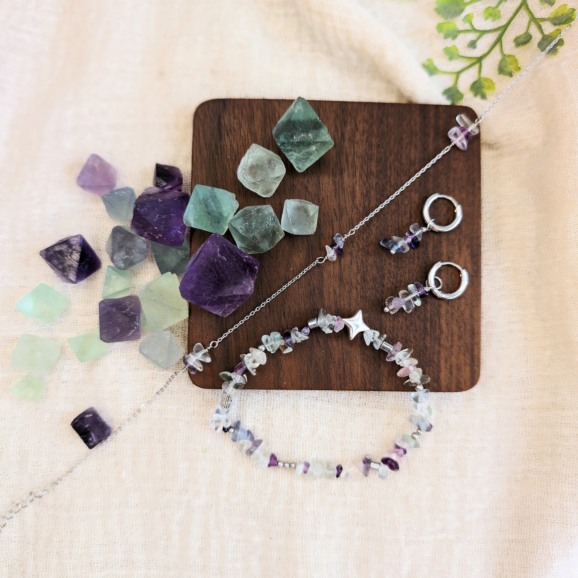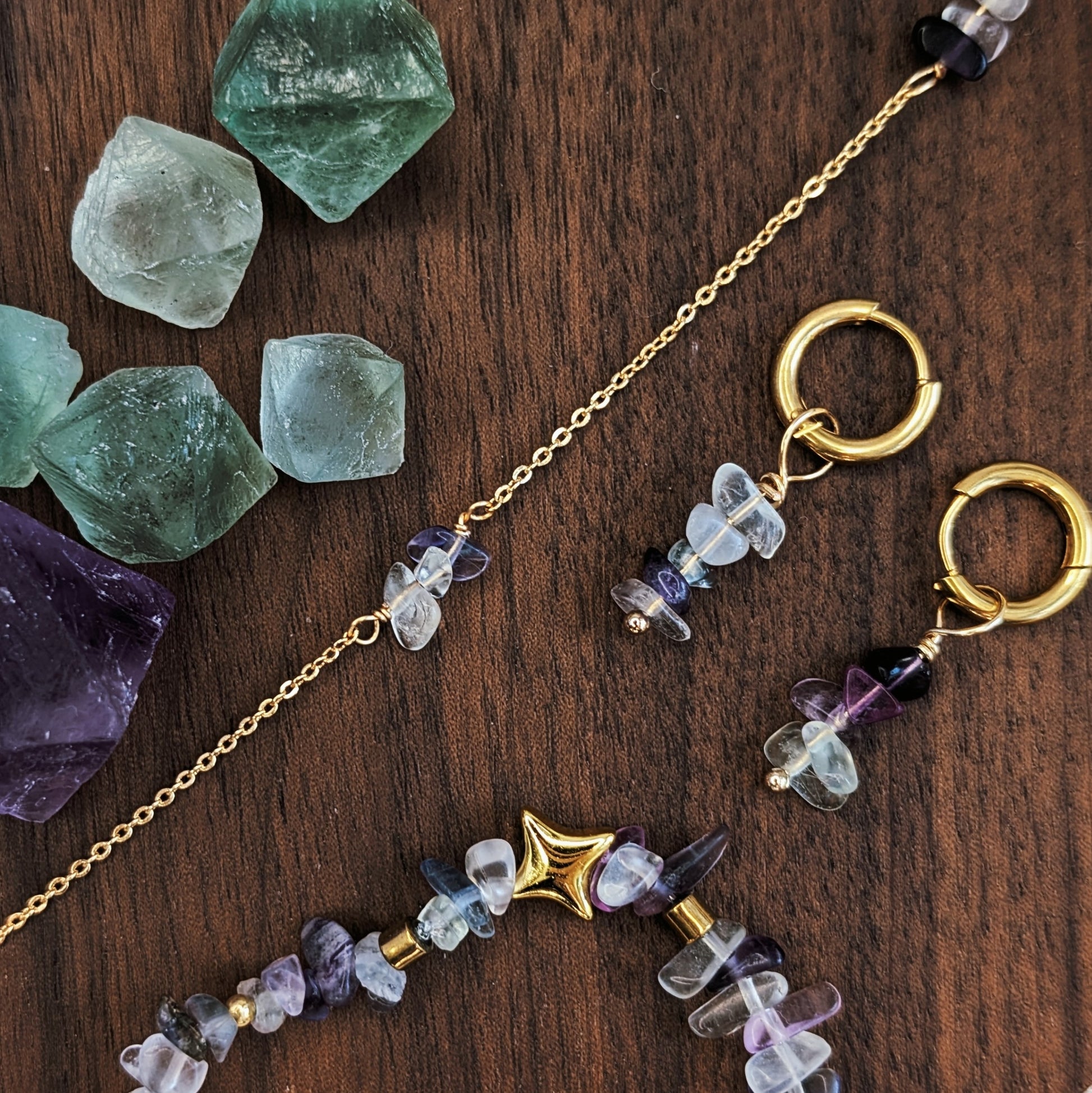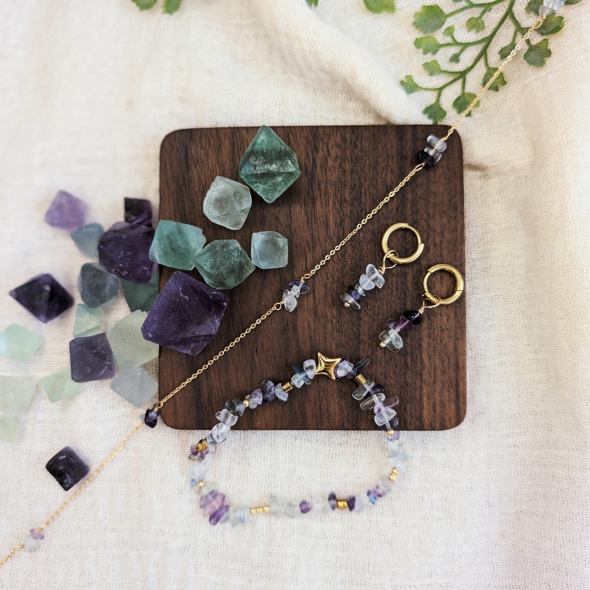 Die Schmuckstücke greifen die typischen Farbnuancen des Fluorits auf – von klarem Grün bis zu sanftem Violett. Die Splitter sorgen für eine organische, naturbelassene Ästhetik, die jedes Set zu einem Unikat macht.