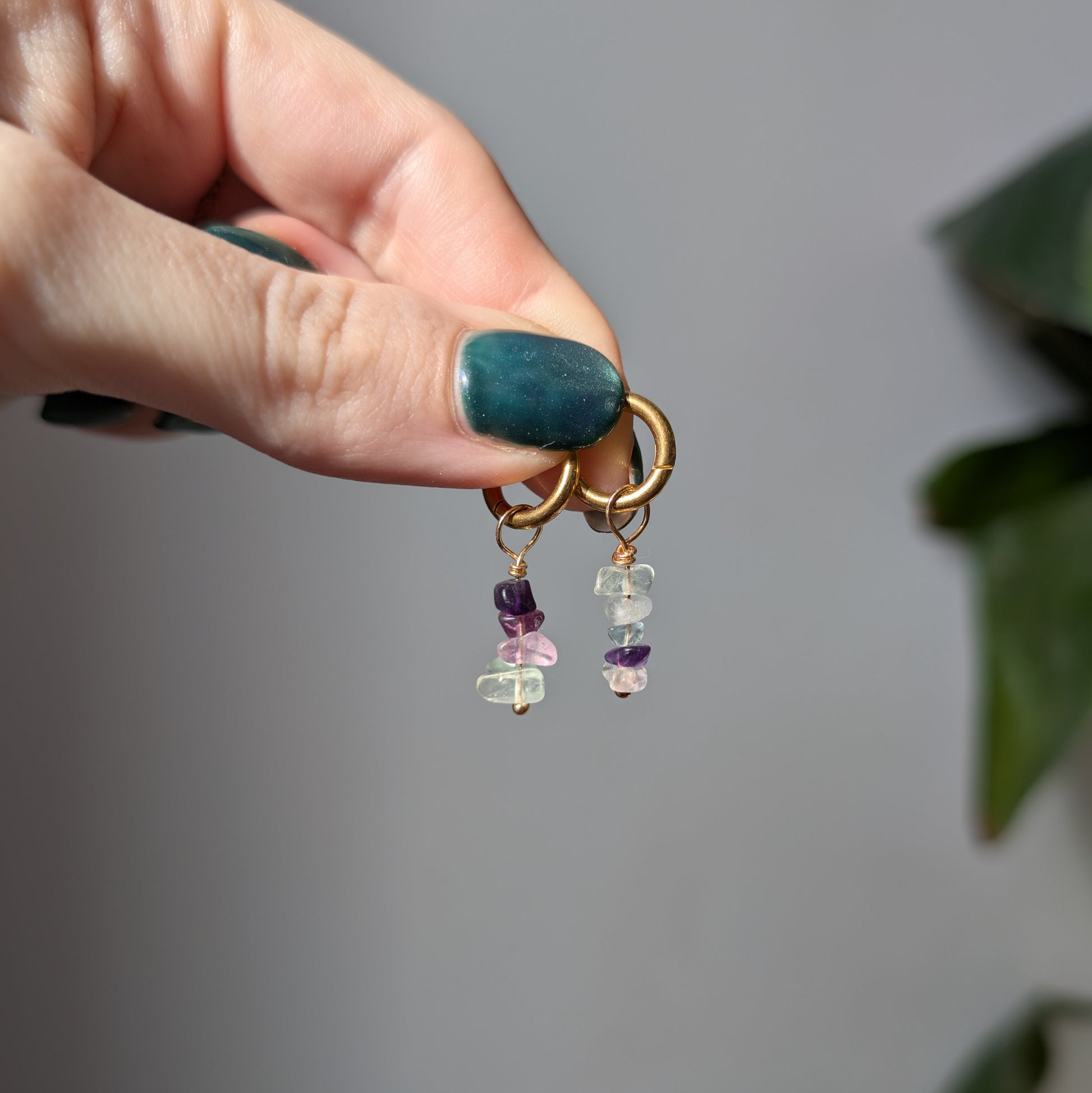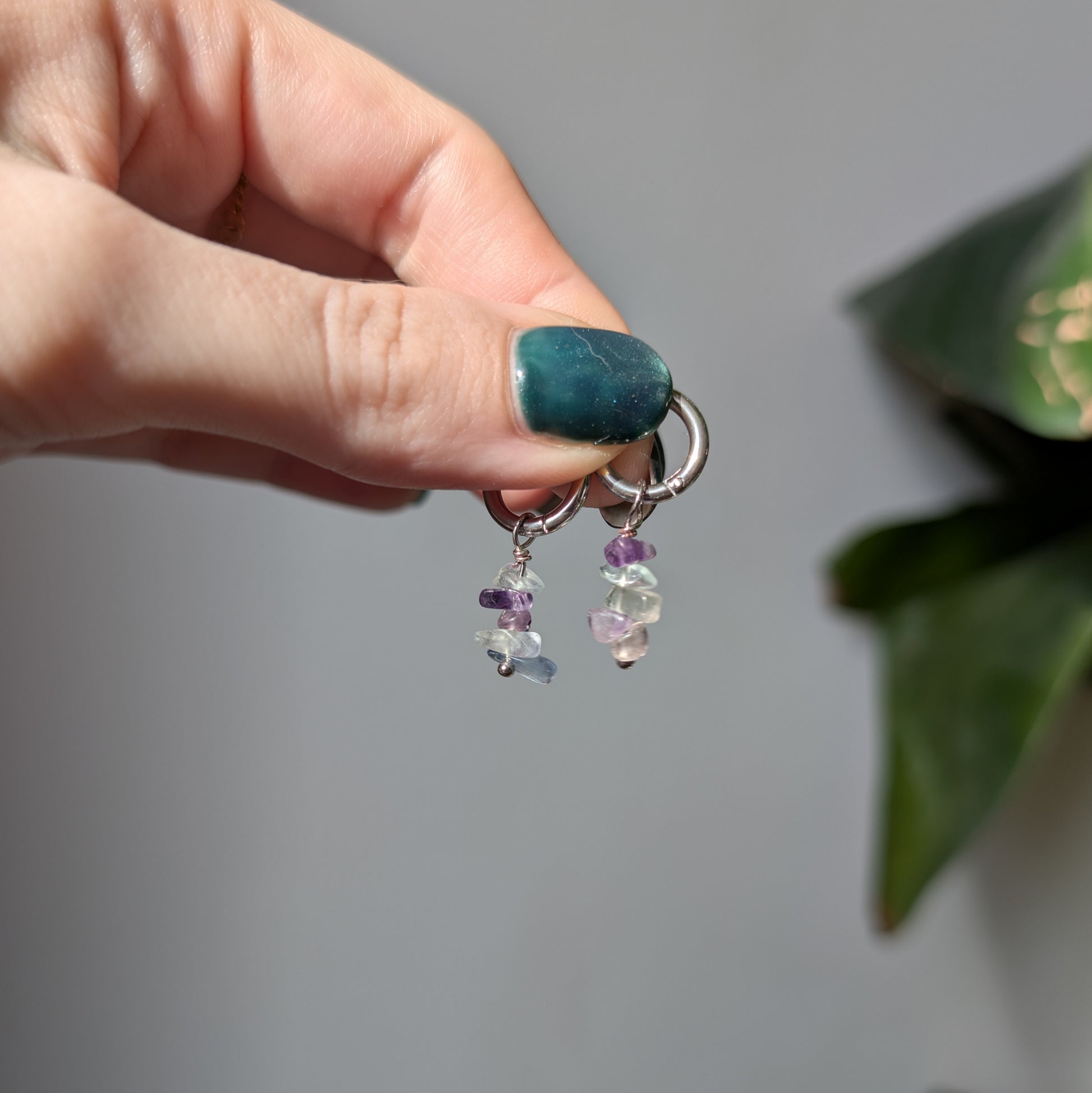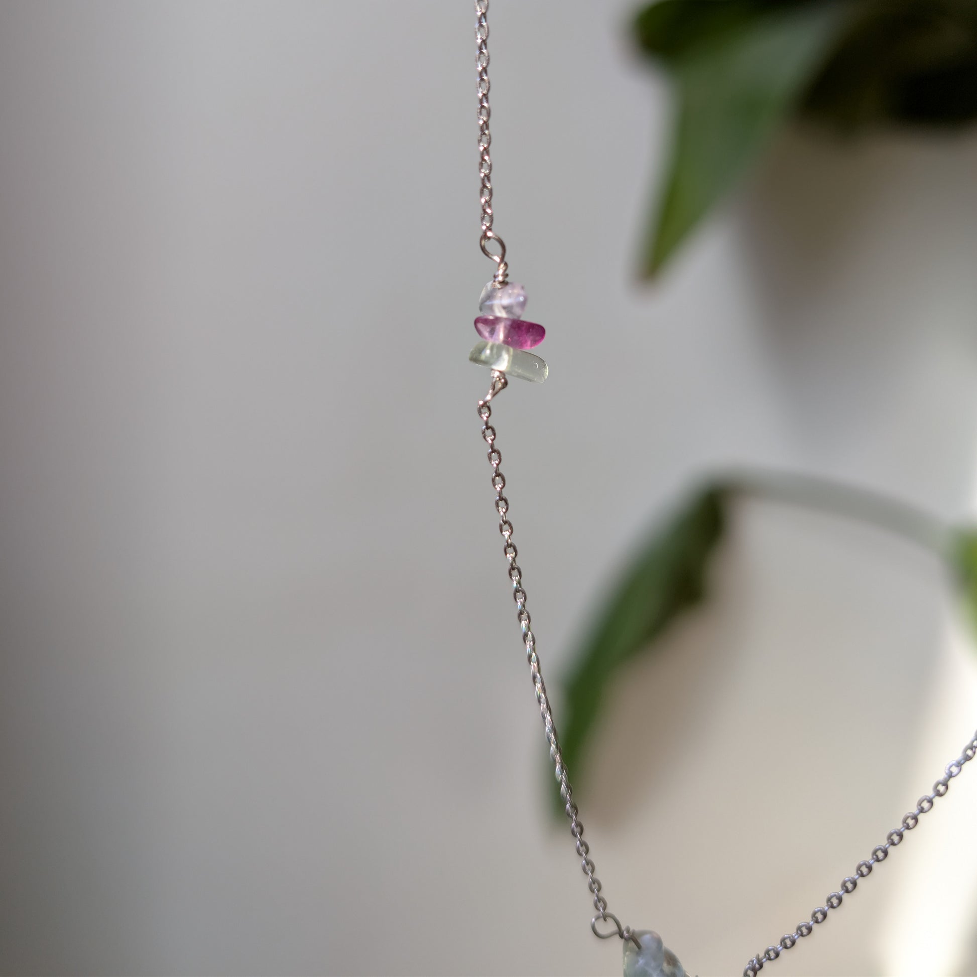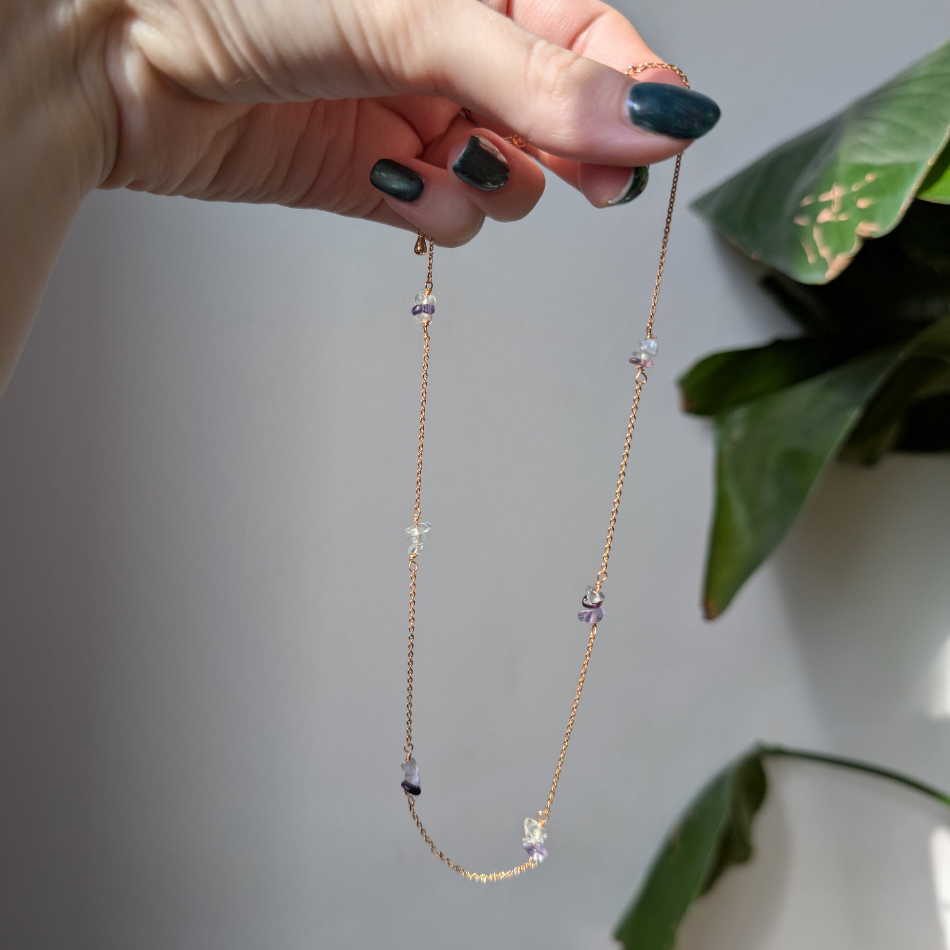 Die Schmuckstücke greifen die typischen Farbnuancen des Fluorits auf – von klarem Grün bis zu sanftem Violett. Die Splitter sorgen für eine organische, naturbelassene Ästhetik, die jedes Set zu einem Unikat macht.