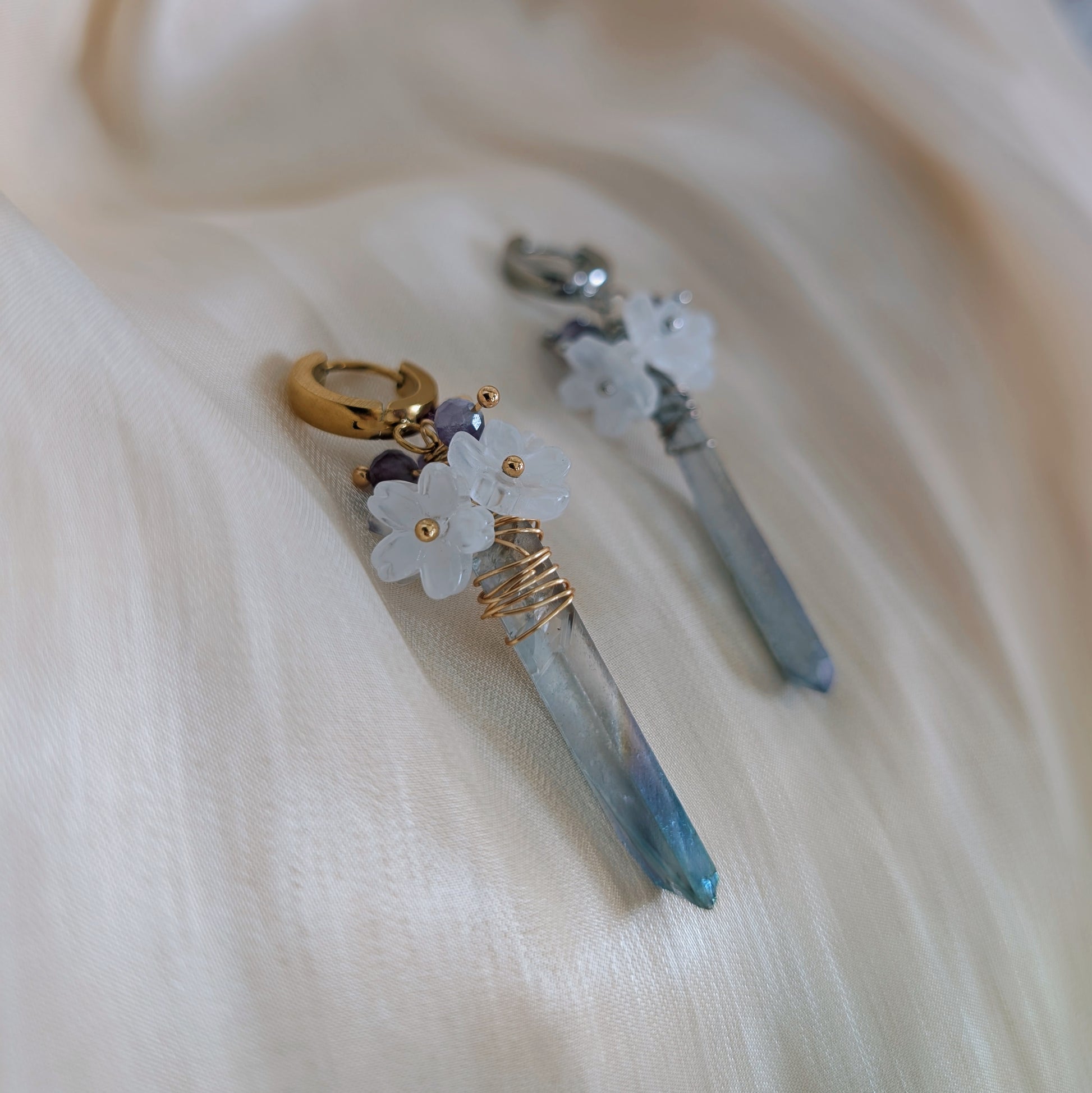 Lange Bergkristall-Spitzen mit schimmernder grau-blau-lilaner Aura bilden das Herzstück dieses Designs. Jede Spitze wurde von Hand mit Draht umwickelt – wie von feinem Elfenhandwerk eingefasst.